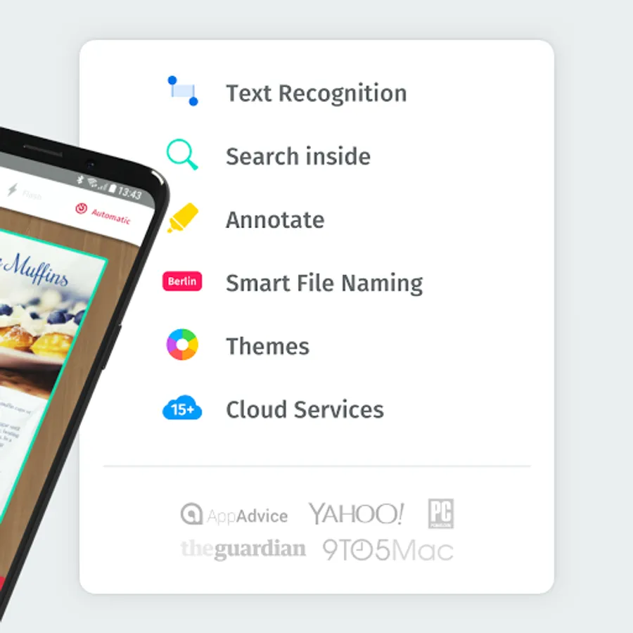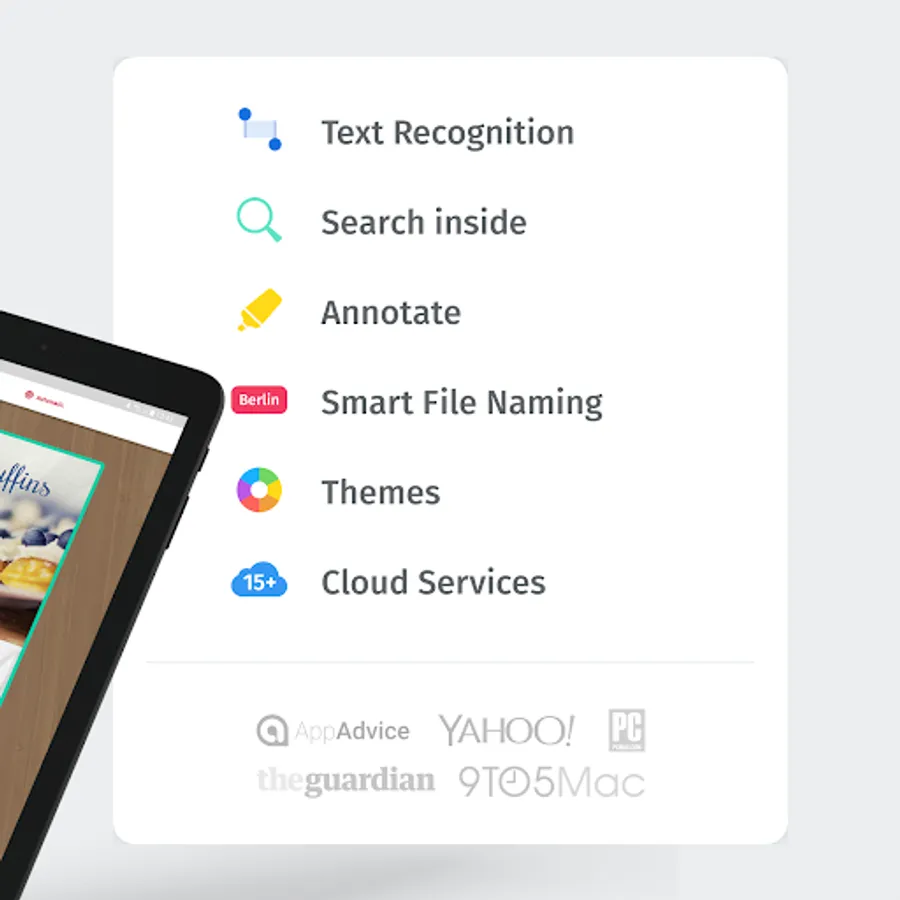 • OCR: extract the text of your scans to copy, search, lookup, etc.