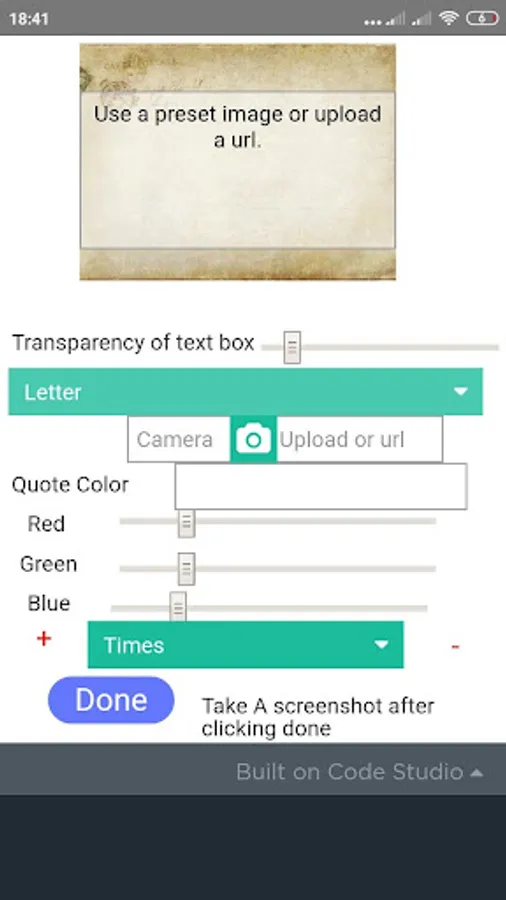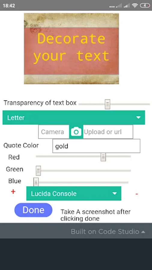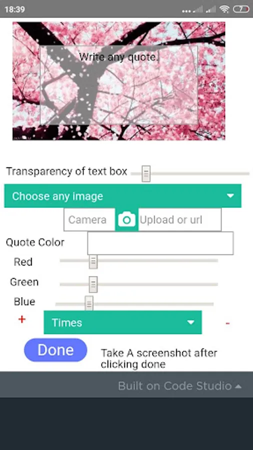 Heroes Quote Maker enables you to write on an image and decorate text.It allows you to change font-family,font-size,text color. You can change the background image to preset options,uploading a url and also clicking a photo and typing on it.You can also upload photos from your camera for a good background.You can change the background of the text box you type in.This is best for people who want to deliver messages in an effective way and for people who need to talk in a serious video meeting where they want to change their background to a useful message.I made this app to help my aunt who would always be singing poems and songs and delivering speeches so that she could write her messages in a more effective way.