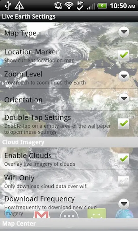 Live Earth includes numerous settings: five zoom levels, portrait and landscape modes, daytime only mode, nighttime only mode, with and without cloud imagery. You can show your location on the map, and you can center the map on your location or any other location in the world!