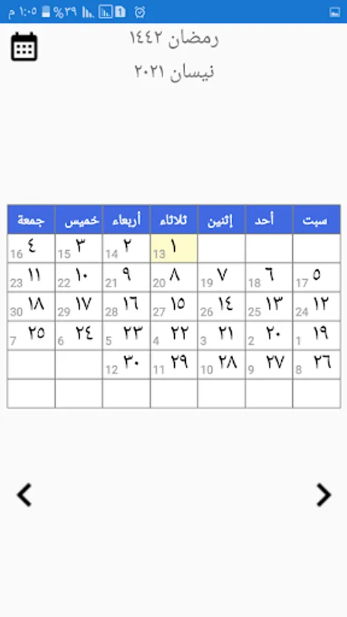 • Calendar with Arabic interface, Arabic numerals and right-to-left layout