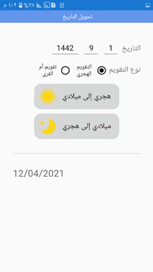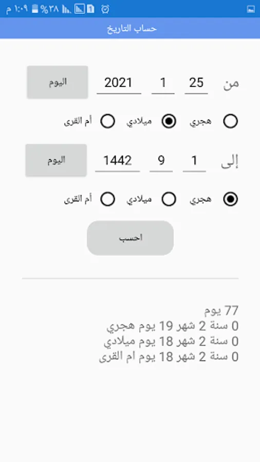 • Calculating the period between two dates, and the beginning can be in Gregorian, for example, and the end date in Hijri or Umm Al-Qura calendar. The number of days will be calculated and given the corresponding period according to the three calendars (Hijri, Gregorian, and Umm Al-Qura).