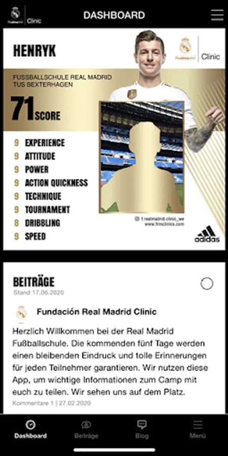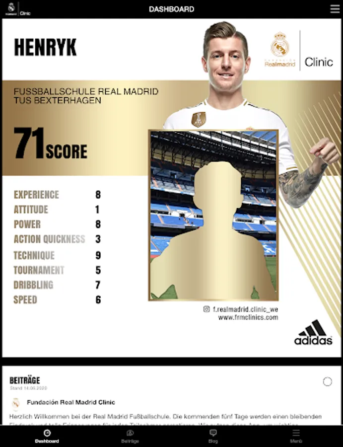 With the official app of the Fundación Real Madrid Clinic, participants receive information, knowledge, tips and their digital scorecard. You can look forward to topics such as nutrition and freestyle! You can also see your performance in the clinic with the scorecard.