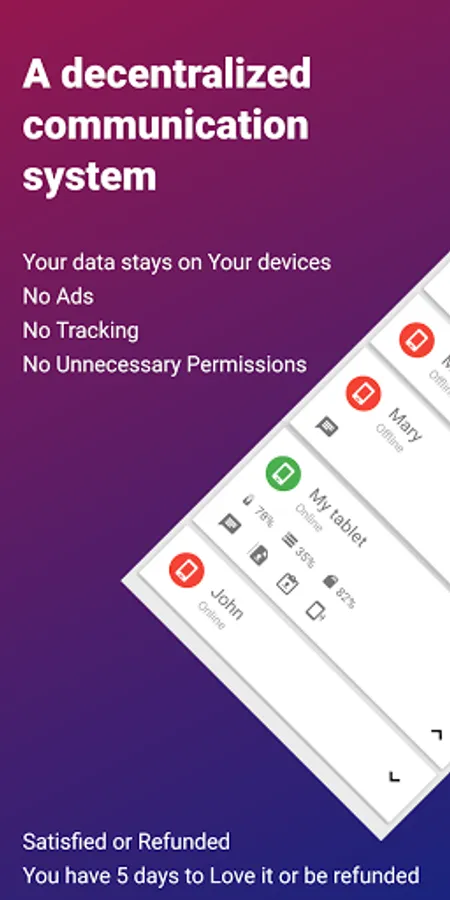 • Connect: easily connect your devices using only your local network and only when you need it over the Internet. Without the mandatory use of external servers. Without ads and tracking. Your data stays in your devices.