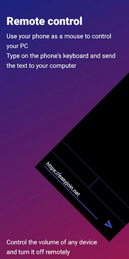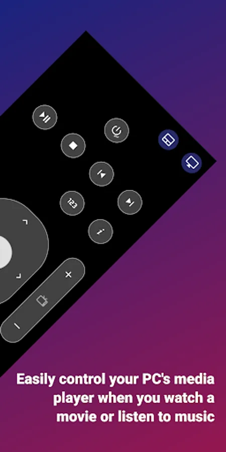 • Remote control: use your phone as a mouse to control your PC. Easily control your PC's media player when you watch a movie or listen to music.Type on the phone's keyboard and send the text to your computer. Control the volume of any device and turn it off remotely.