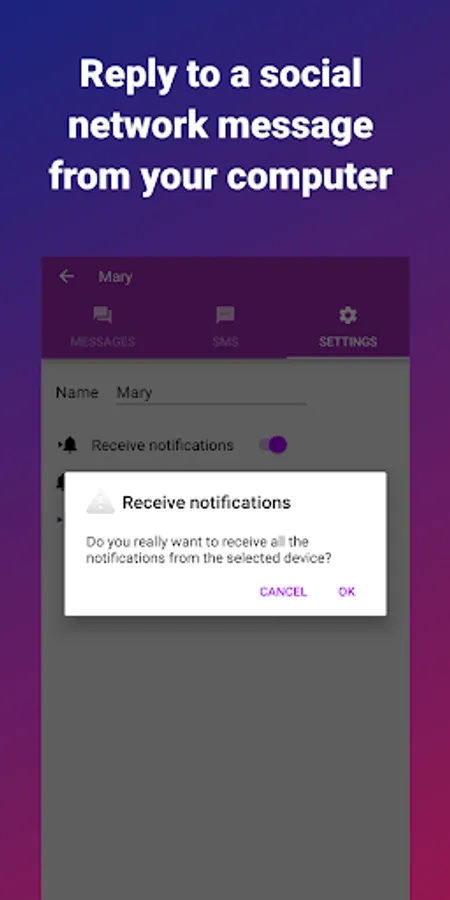 • Notifications: send to PC the notifications of your phone. Reply to any text message from your PC. Trigger an action and dismiss a remote notification.