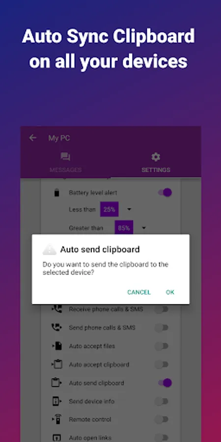• Clipboard: send the clipboard text from one device to another. Auto-sync the clipboards between your devices. Auto-sync works on the Q version of Android using a private clipboard.