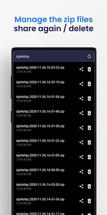 • Share the zip file with any application, send it via email, message or save it in the cloud.