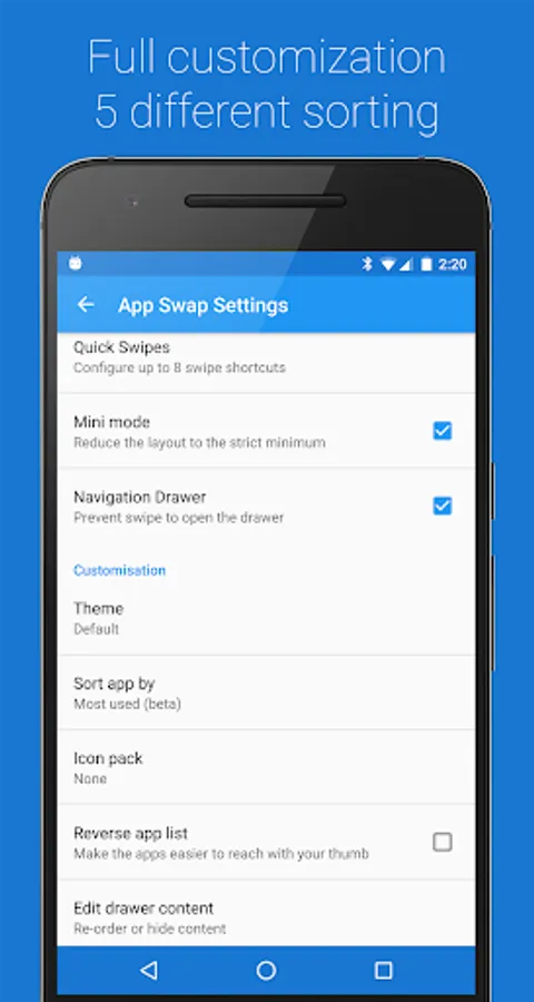 App Swap is a drawer which allow you to easily launch your applications. It works with your existing launcher (Google Now, Nova, Yahoo Aviate, Everything Me, Action Launcher,...).
