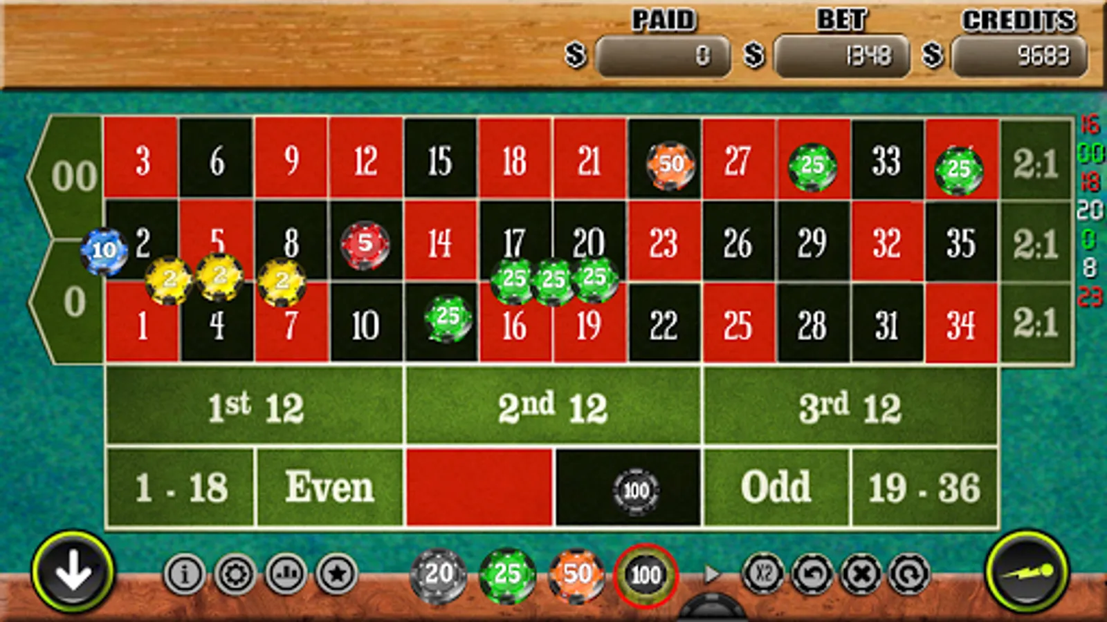 Ability to undo your last bet with the appropriate key, historicizing the last numbers come out on roulette with the color display and number.