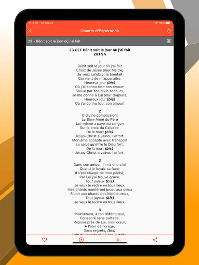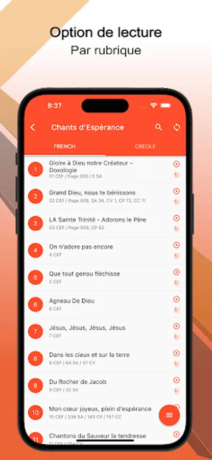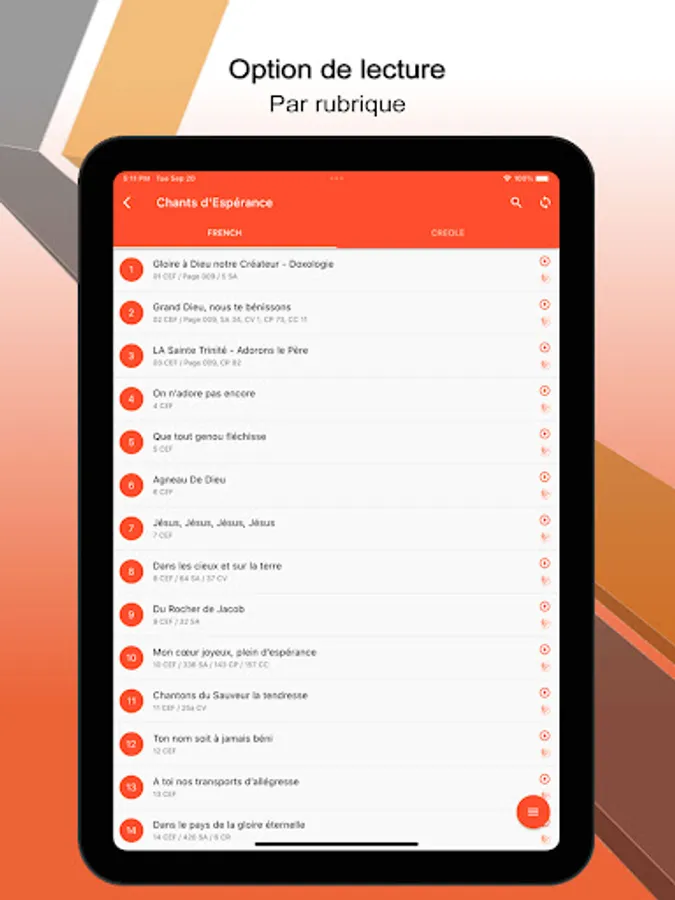 The application offers more than 12 Collections of Chants of Hope and more than 1,700 lyrics available in French, Creole and English. Here are the headlines: Chants D'Ésperance, Mélodies Joyeuse, Haiti Chante Avec Radio Lumière, La Voix du Réveil, Let us wake up, Echo Of The Chosen Ones, The Shadow of Revival, Glory to the Lamb, The Canticles of Beraca, The Special Canticles, Let us wake up Christians, The Songs EEBV.