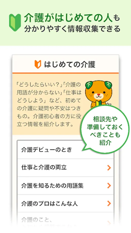 このアプリでは、そういった方のために介護についてわかりやすく解説した「はじめての介護」や、介護の相談先となる「地域包括支援センター」の情報、愛媛県内各地にある介護事業所の検索、介護に関するQ&A、そのほか毎日の献立に役立つ管理栄養士監修のレシピなど、介護に関する情報が満載です。