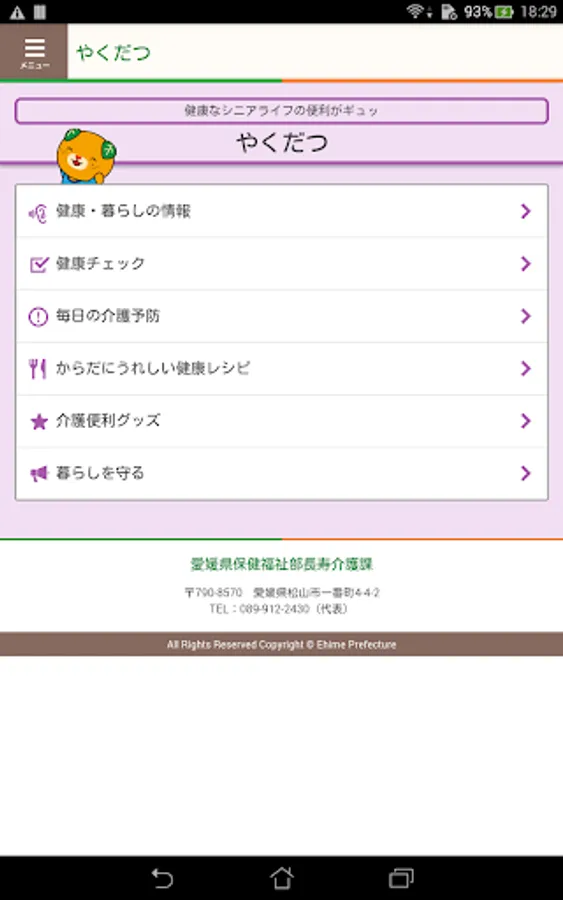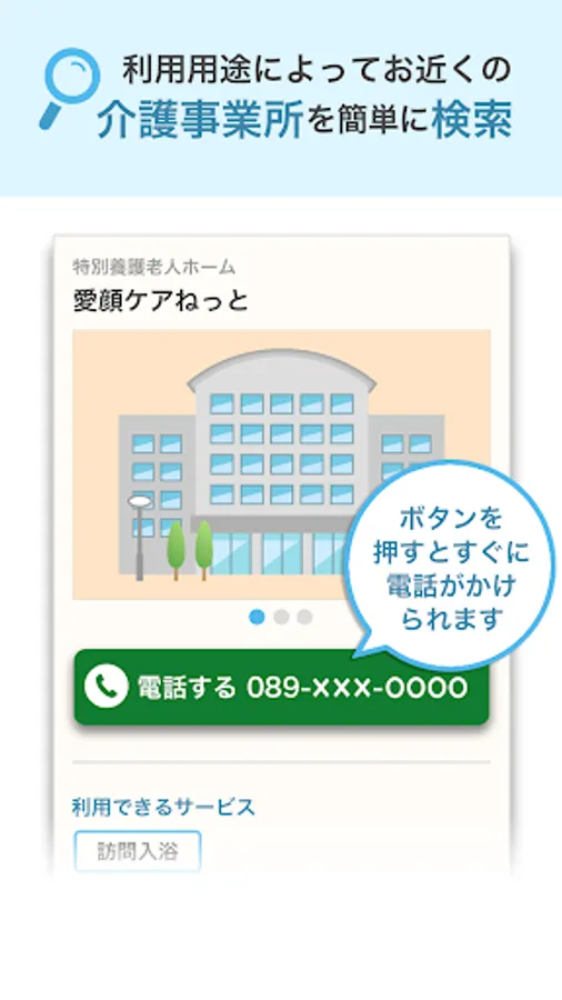 愛媛県の公式アプリ「愛顔(えがお)ケアねっと」は、初めて介護を受ける方を家族にもつ事になった方や介護従事者の方に向けた、介護に関する情報アプリです。