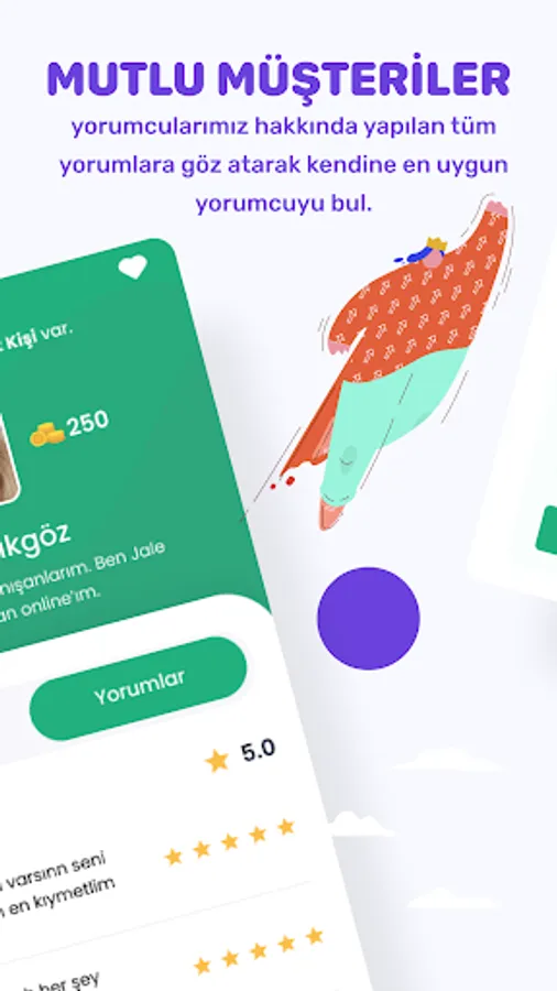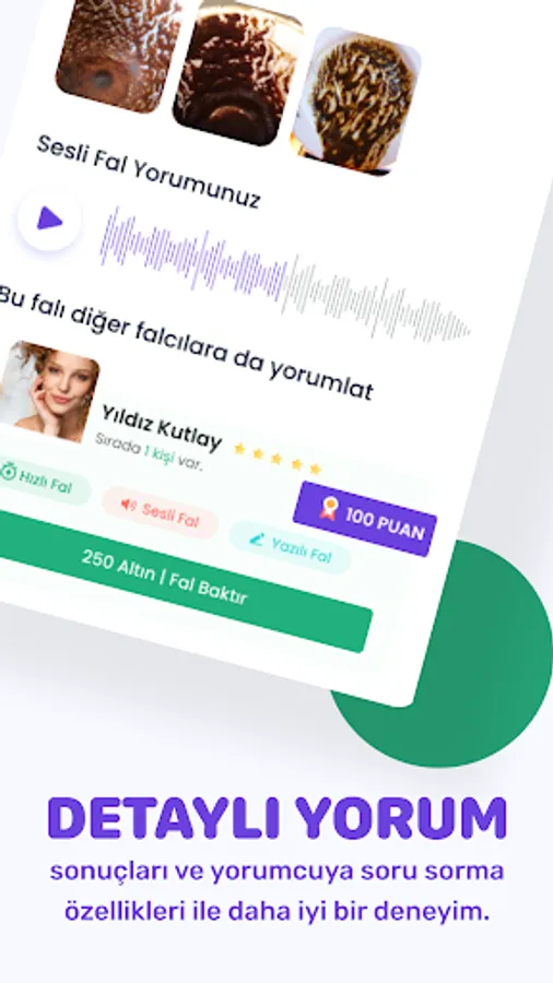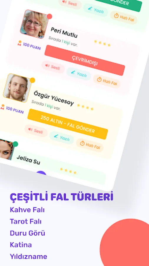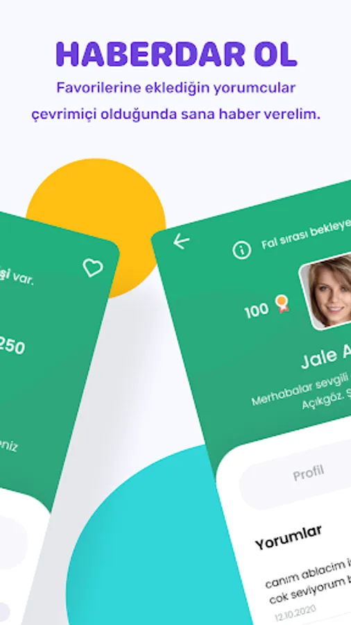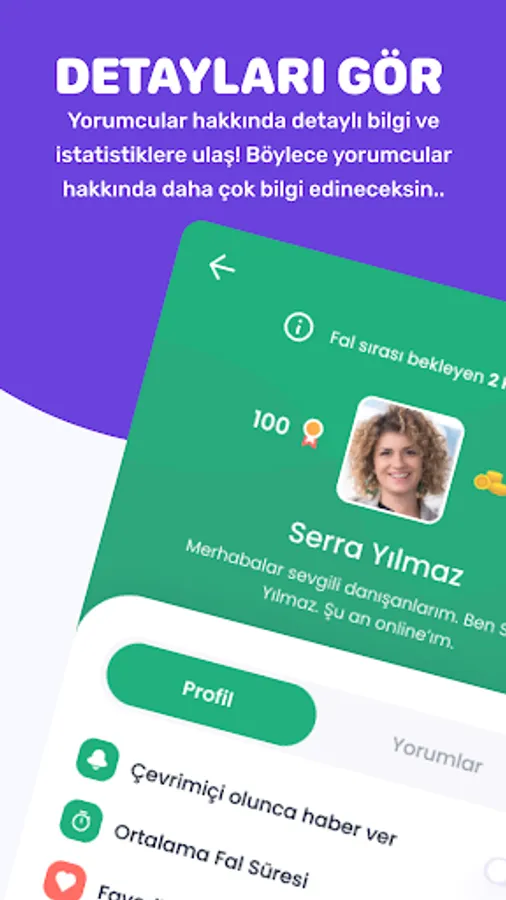 The biggest difference of our application is that you should interpret your dreams. Also easy to use and simple interface does not take your time. You can also bookmark your favorite fortune tellers and receive instant notification when they are online. Certainly do not write short reviews. All comments and fortune-telling team are controlled by our editorial staff. The aim of Fal Evi is to provide the best service to our users who want to have fortune telling. Comment to the fortune teller who is looking at your fortune, give your score, and then the fortune-telling will inspire you!