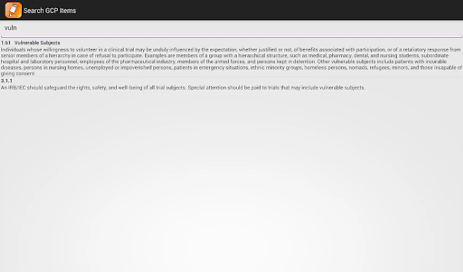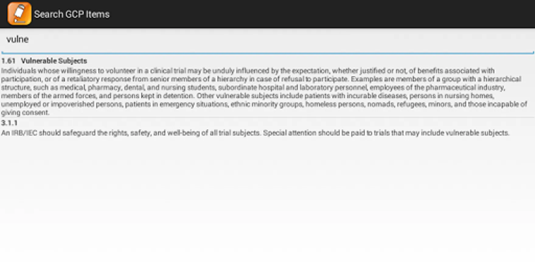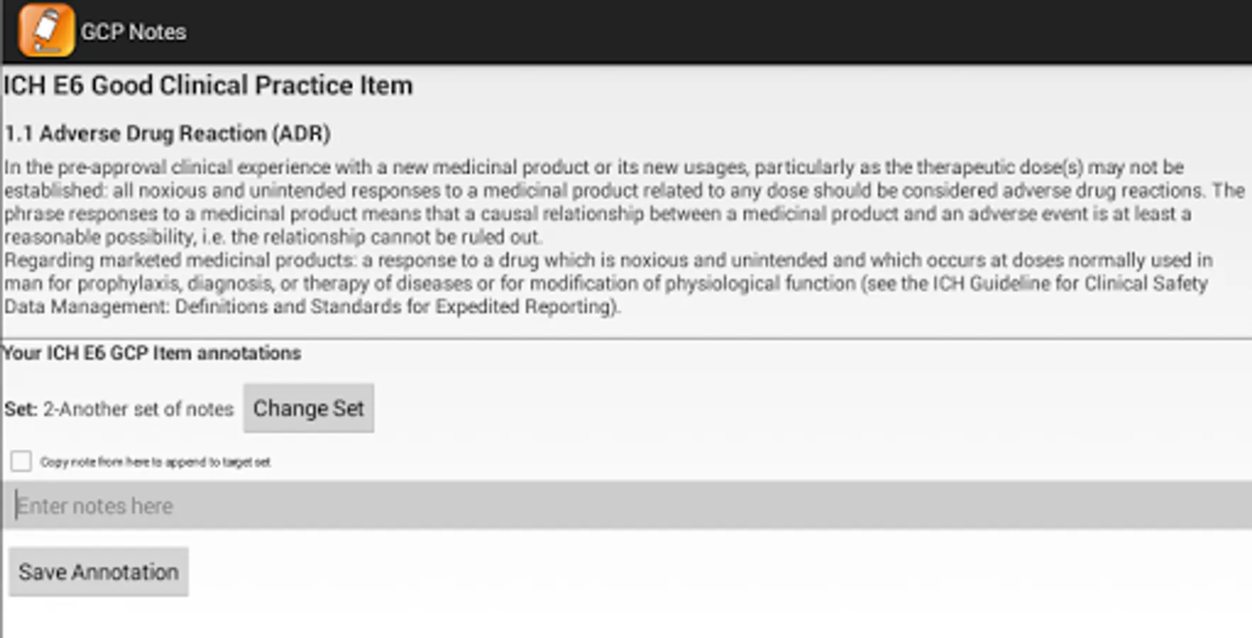 GCP Notes allows you to browse or search the full text of ICH E6 GCP. You can attach notes to any article of GCP and maintain unlimited sets of GCP notes. Notes can be emailed to the recipient(s) of your choice; these can be sent as a single item within the body of an email or as a complete set of notes within an excel file. Additionally, GCP Notes allows you to complete checklists to evaluate if an Informed Consent Form or a file of Essential Documents is compliant with ICH E6 GCP. Completed checklists can be archived on your android mobile device and/or emailed to the recipient of your choice as an excel file.