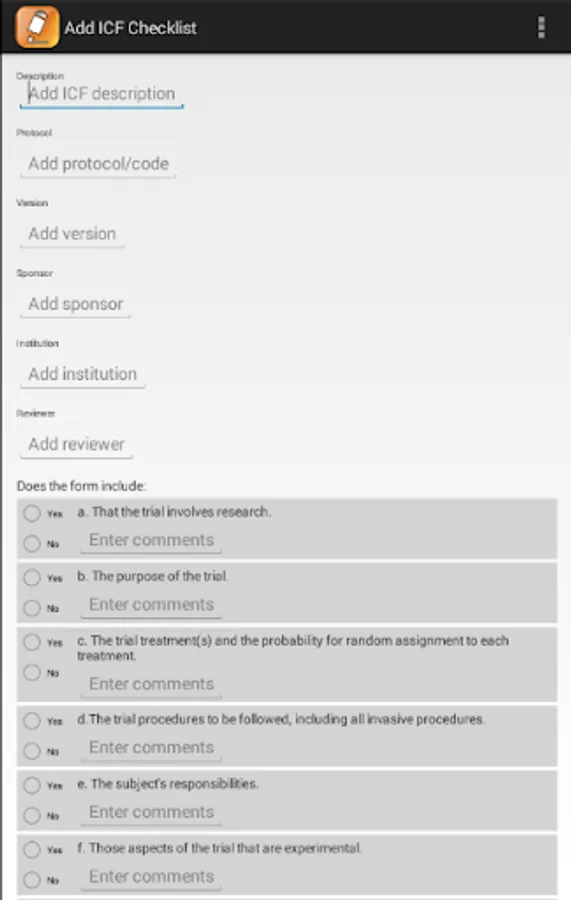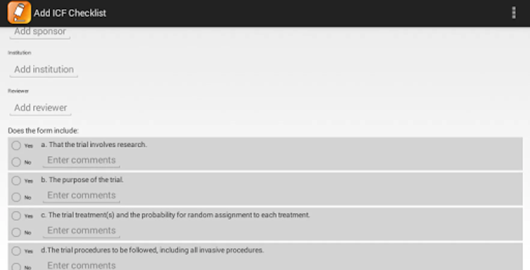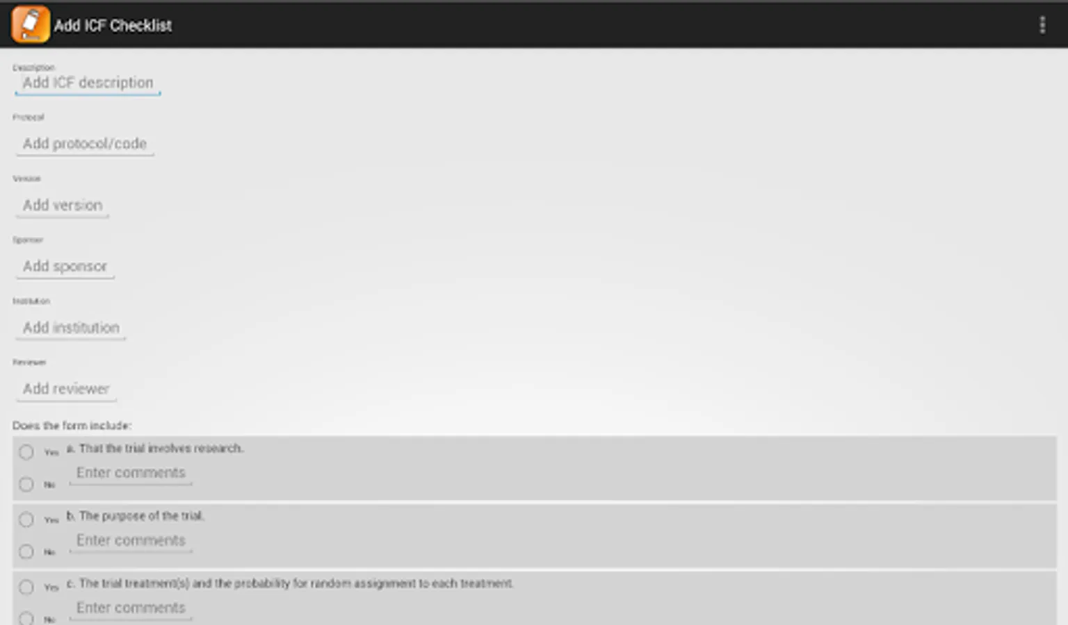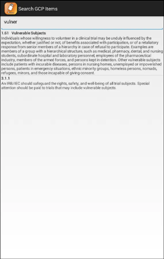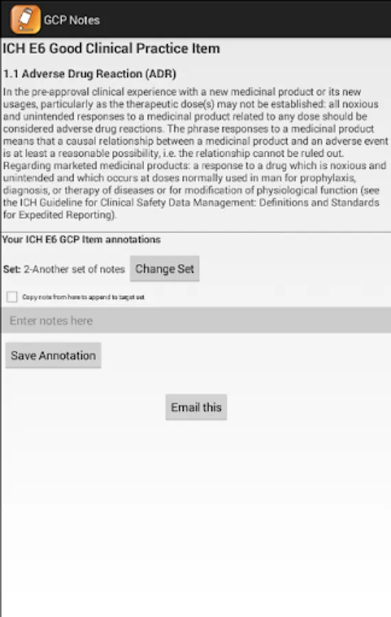 GCP Notes allows you to browse or search the full text of ICH E6 GCP. You can attach notes to any article of GCP and maintain unlimited sets of GCP notes. Notes can be emailed to the recipient(s) of your choice; these can be sent as a single item within the body of an email or as a complete set of notes within an excel file. Additionally, GCP Notes allows you to complete checklists to evaluate if an Informed Consent Form or a file of Essential Documents is compliant with ICH E6 GCP. Completed checklists can be archived on your android mobile device and/or emailed to the recipient of your choice as an excel file.