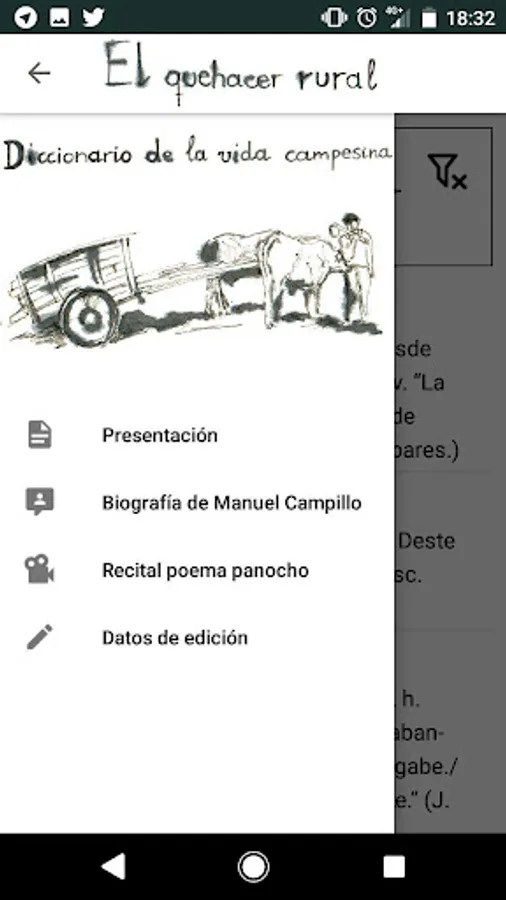 In this Dictionary, which I have given the title of rural work, I wanted to collect the words-less and less used-of that marginalized and forgotten world farm, and with them I wanted to also collect the experiences, their own and those of others many who were born in my land Murcia and other Spanish lands or overseas but inhabited by Hispanics.