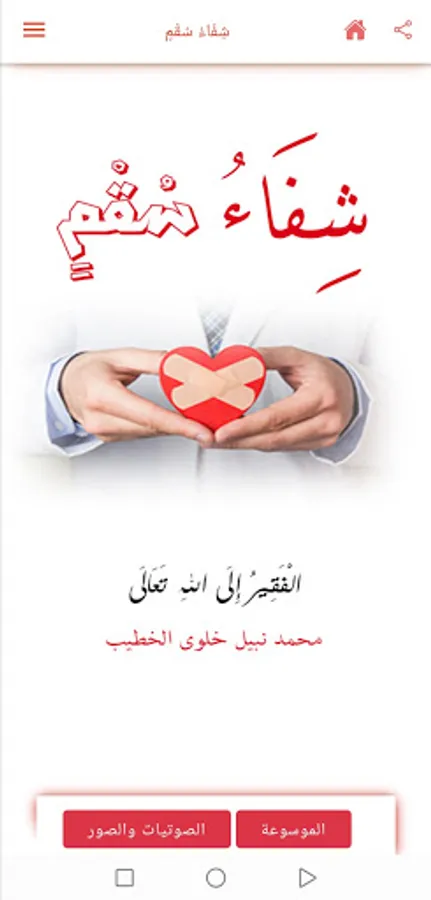 The application of the booklet "Healing Sickness" is a pocket booklet containing many of the benefits selected from the Encyclopedia: "Her physician who created it"; So that it is easy for the sick person to carry it, review it, and benefit from it. The application includes 153 audio clips, and 207 images of new information that you can share for free with your friends and loved ones.