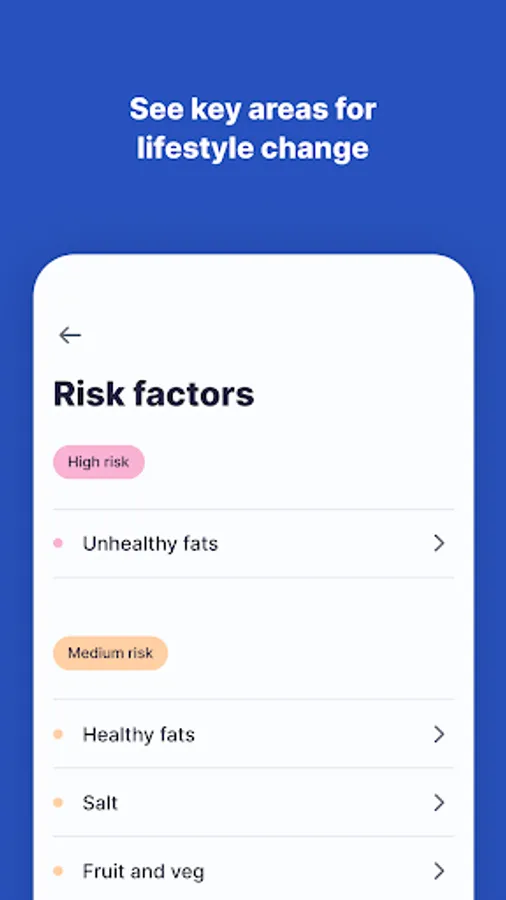Red, amber, green-rated risk factors highlight key areas for lifestyle change supported by custom advice and recommended goals.