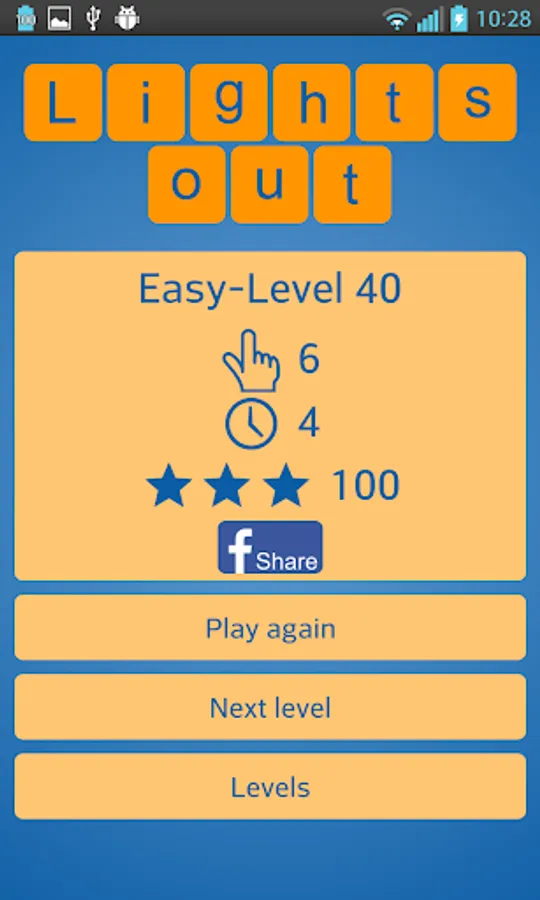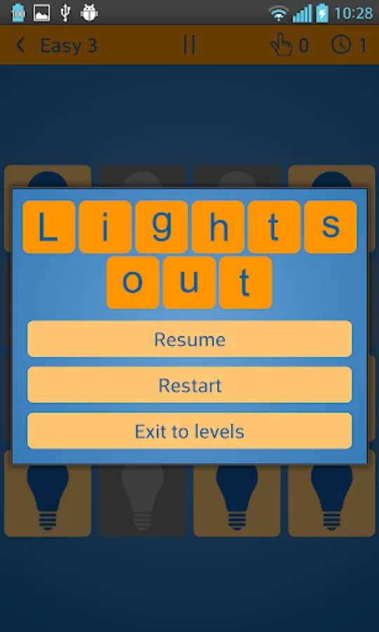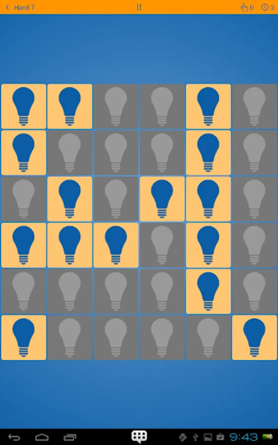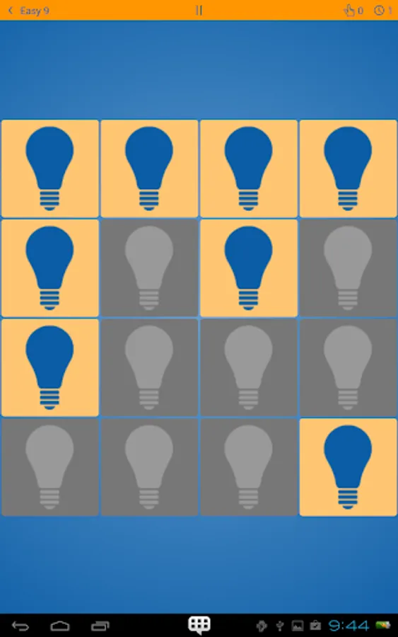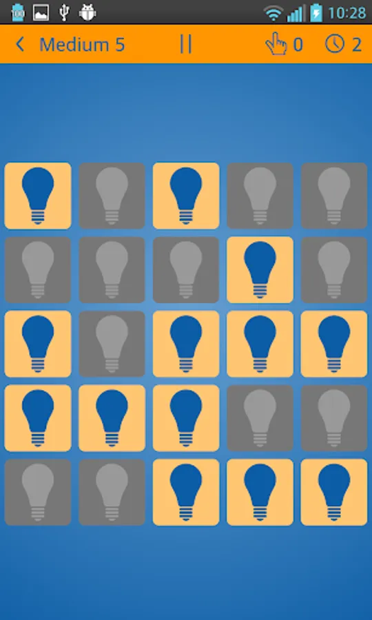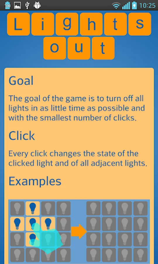 Lights out is simple but challenging brain and puzzle game. Player gets board with some lights on and some off. The goal of the game is to turn off all lights in as little time as possible and with the smallest number of clicks. Every click changes the state of the clicked light and lights above, below, left and right of clicked light (turned on light becomes turned off and vice versa).