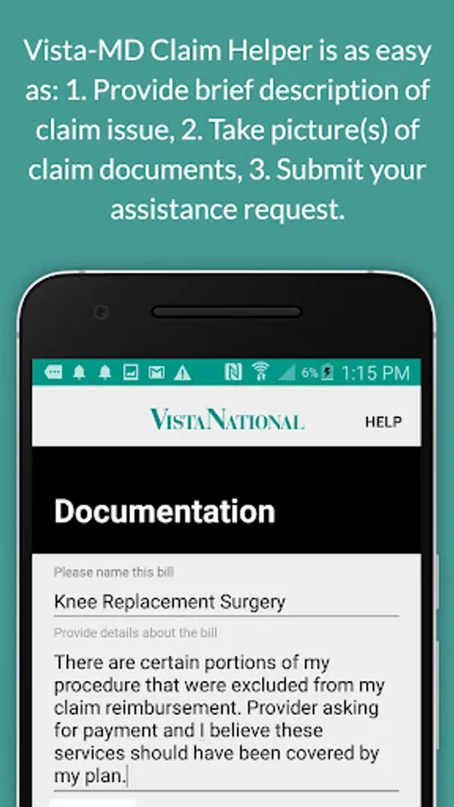 Vista-MD Claim Helper™ is an easy and convenient way to get assistance on your medical, dental, disability, vision and other benefit claims to resolve claim issues and manage billing appeals. Our mobile solution allows you to dispatch your request for claim assistance by connecting you to a VistaNational claims expert that will serve as your advocate, provide resolution to your claim issue, and/or negotiate your bill. Our goal is to reduce your healthcare expenses by conducting a medial bill review and provider negotiations – providing you cost savings.