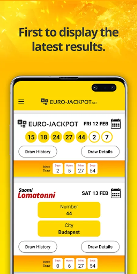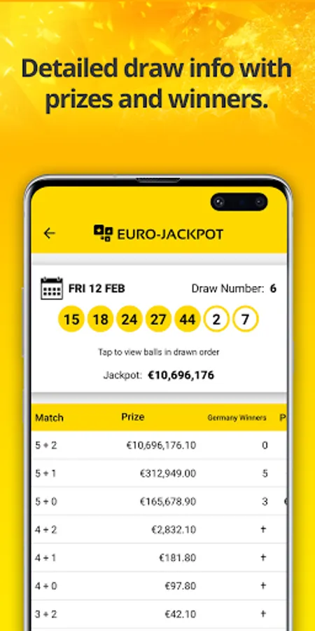Get the latest Eurojackpot results within seconds of the draw taking place. This easy to use app shows the Eurojackpot numbers (including associated draws like Joker) and full prize breakdowns including number of winners and prizes paid.