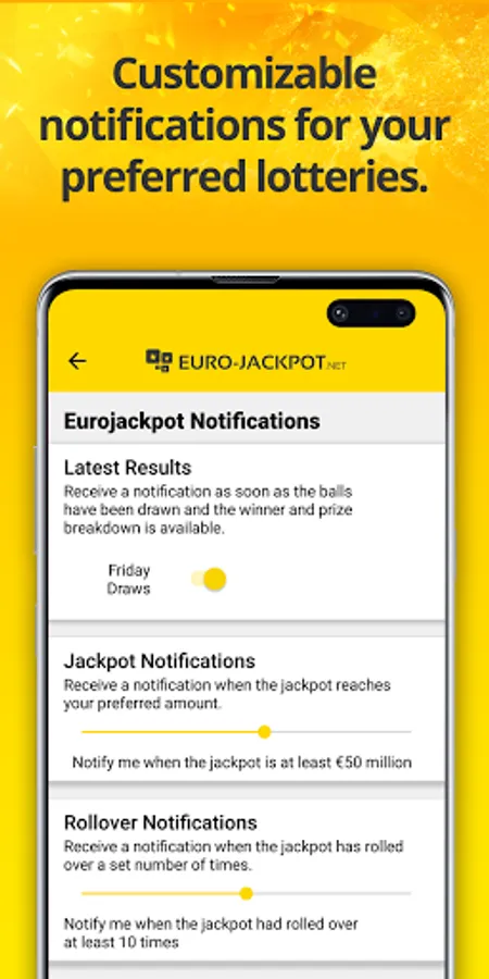 Get notified instantly when the latest Eurojackpot results and prize breakdowns become available. Want to know when the jackpot has rolled over or has reached a certain amount? Just head to the Notification section of the app to set up your alerts. There is also the option to set notifications at times that suit you - great for reminding you to purchase tickets before the draw.