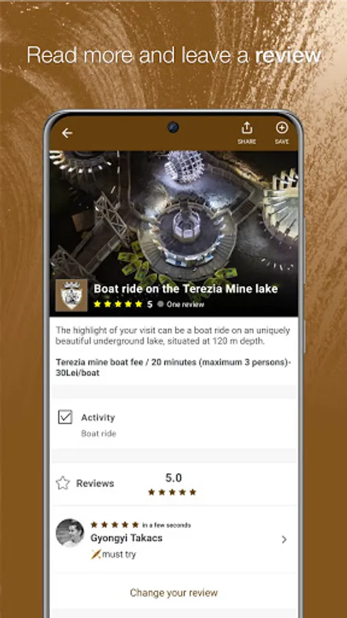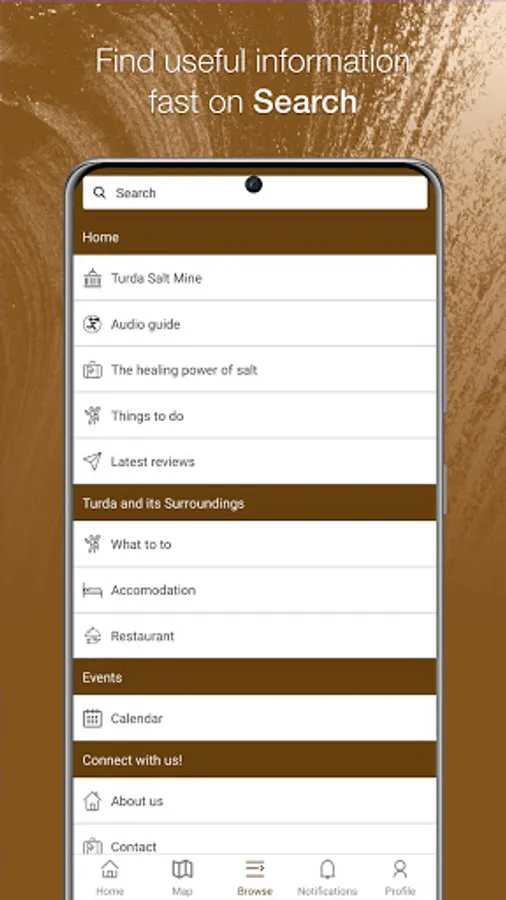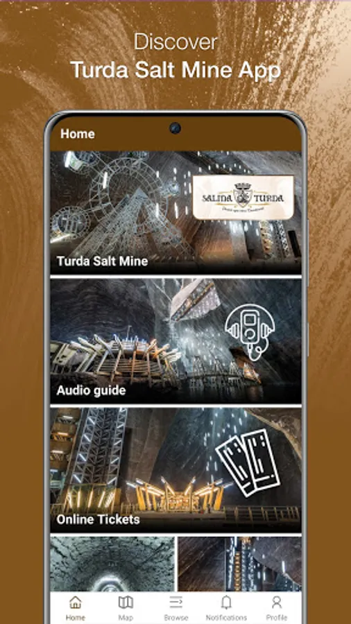 Discover all the amasing spots in Turda Salt Mine. Salina Turda App includes 8 individual galleries for each of the interest points inside the mine. Easy to download, the app offers the possibility to upload reviews. Also, through the Salina Turda App you can acces general information on all touristic attractions nearby the salt mine, lovely accomodation places, restaurants and relaxing retreats.
