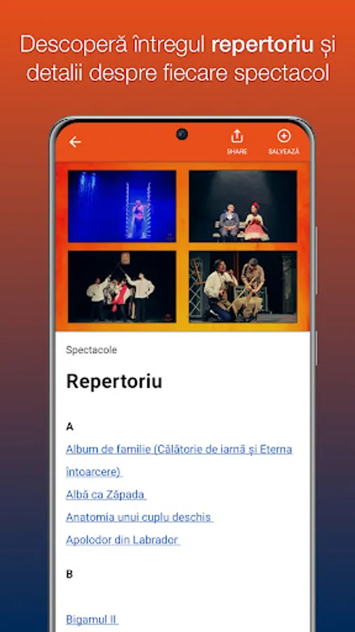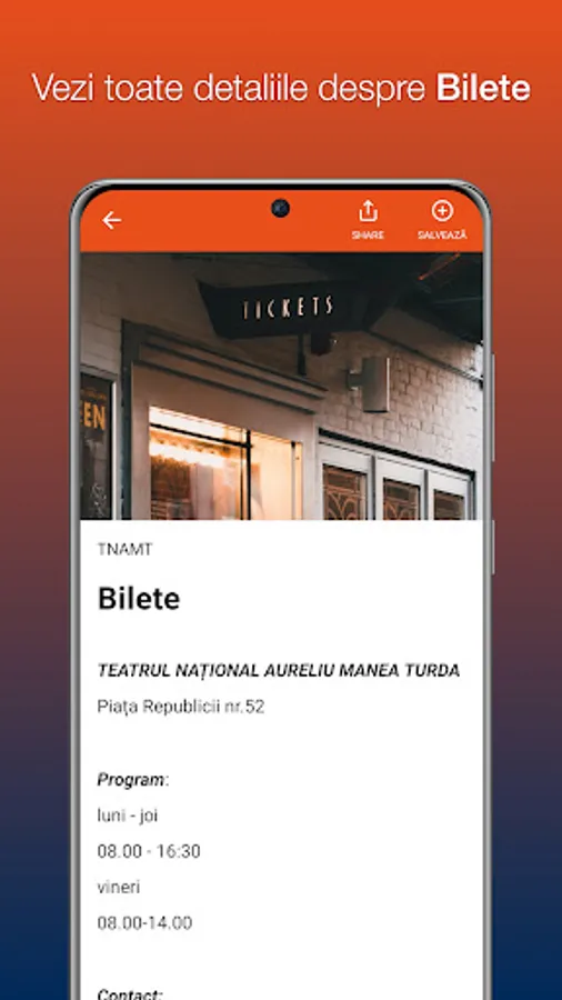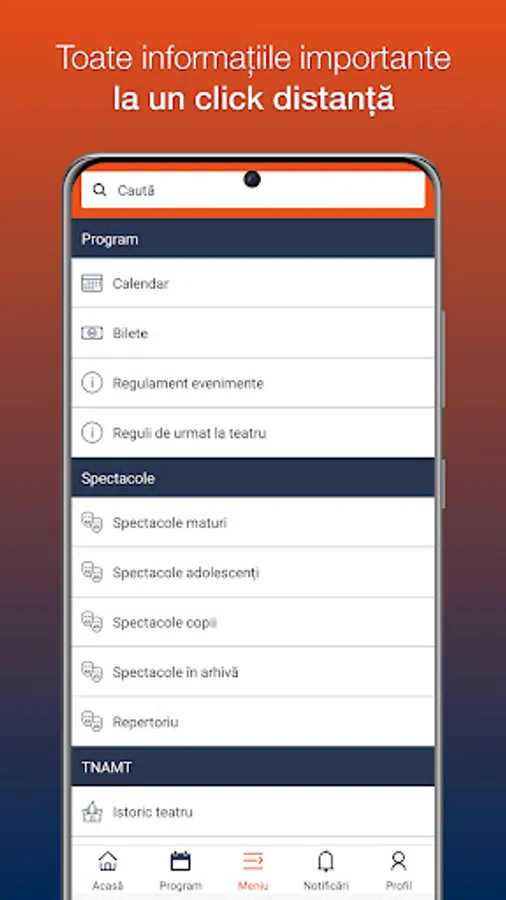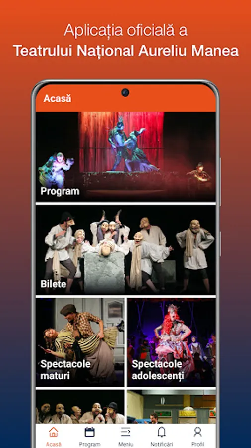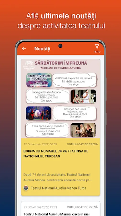 The official application of TNAMT - Aureliu Manea National Theater in Turda provides its audience with information about the theater's performance schedule, the team of each show, as well as its subject, ticket prices, special events organized within TNAMT, TNAMT festivals, and developed projects by the Turdean theater.