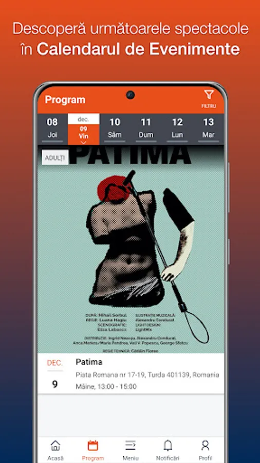 Users have the opportunity to create an account on the theater's application in order to be informed by means of notifications of the following events, or to save in their calendar the shows they want to attend.