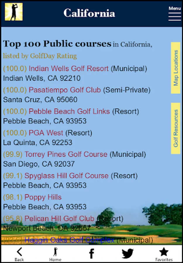 GolfDay California includes over 800 courses in the state of California, with a GolfDay Rating and proximity search making it easy to find a great course near you or where you plan to be. Listings also include rates, booking links, course detail, golf league and junior golf information, mapping/directions and local weather. Don’t waste your valuable time at a Dog Track!