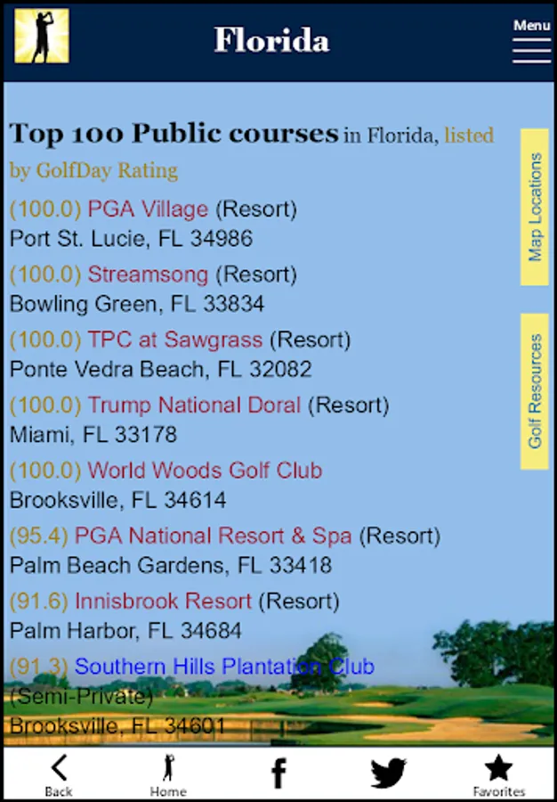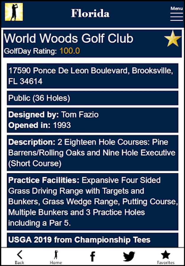 GolfDay Florida includes over 1,000 Florida golf courses, with a GolfDay Rating and proximity search making it easy to find a great track near you or where you plan to be. Listings also include rates, booking links, course detail, golf league and Junior golf information, mapping/directions and local weather. Don’t waste your valuable time at a Dog Track!