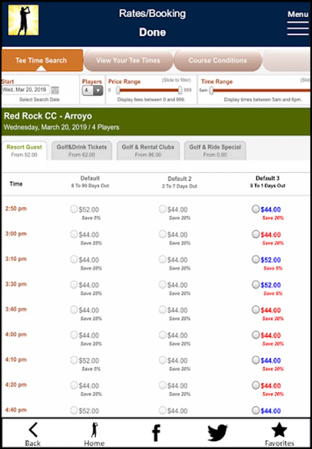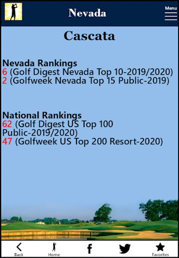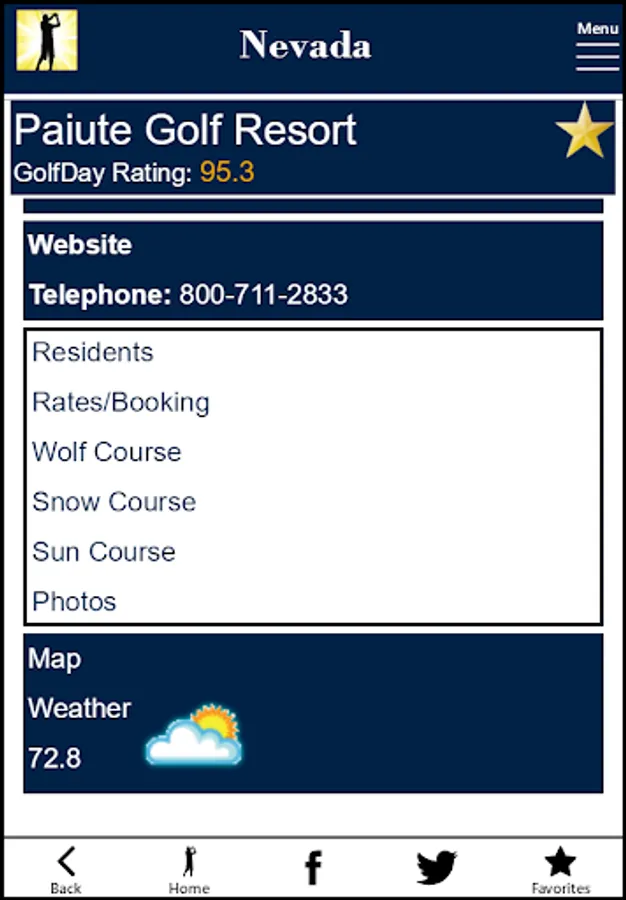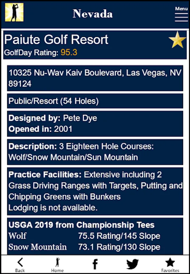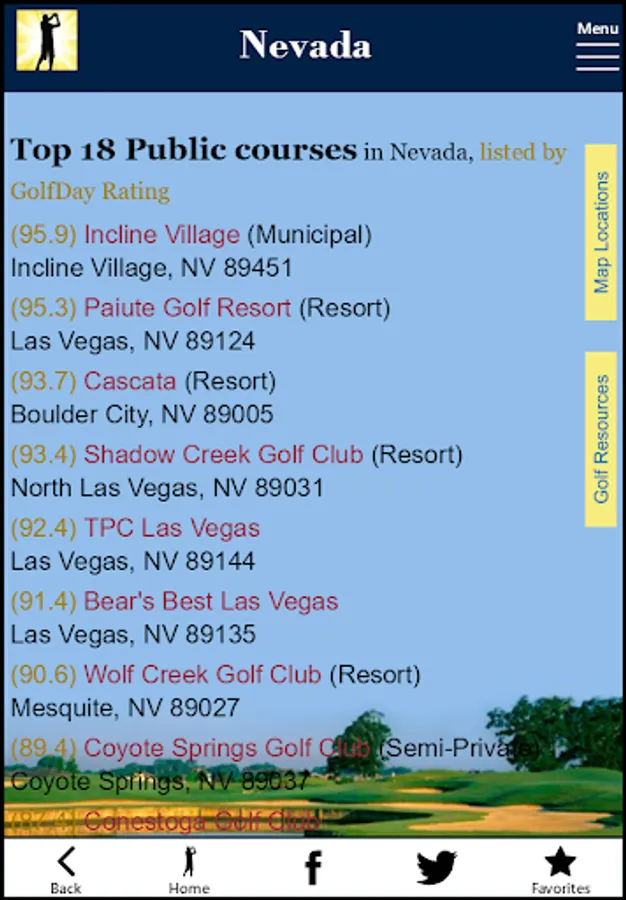 Don’t waste your time at a dog track. GolfDay Nevada includes more than 85 courses in the state of Nevada, with quality ratings and easy searching to find the best courses near you or where you plan to be. You will also have rates, booking, practice facility details, mapping and directions right at your fingertips.