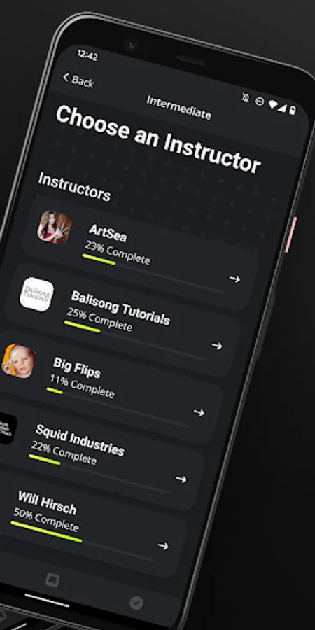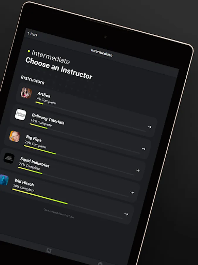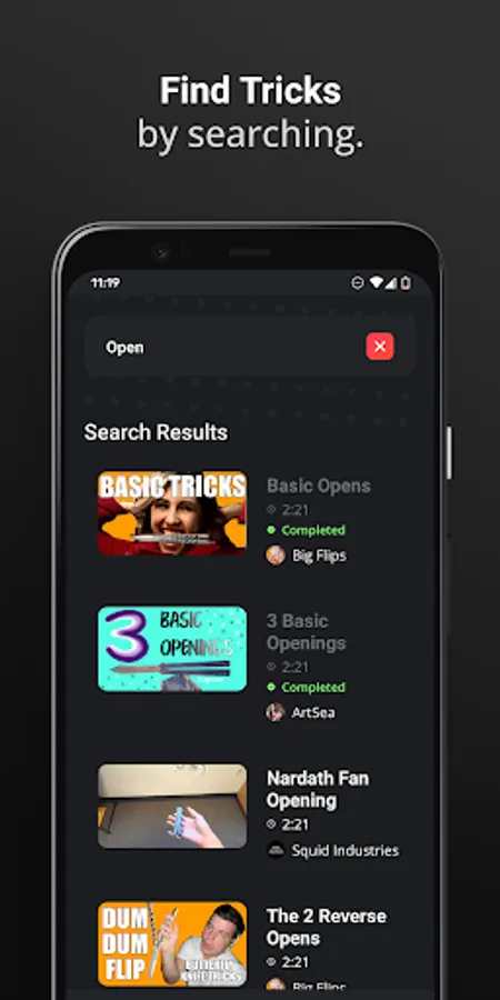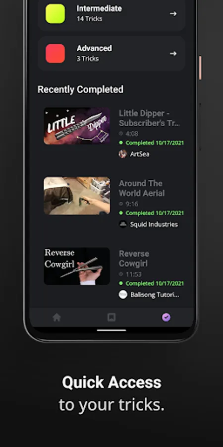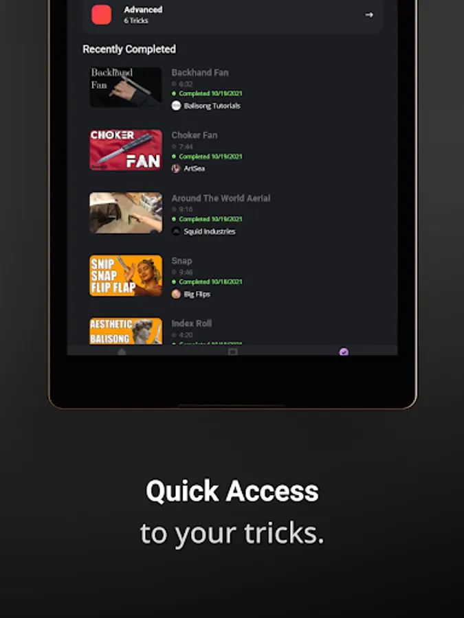 Balisong Mastery empowers flippers to easily sort through tricks published by their favorite creators. Search for tricks by name, or view tricks categorized by difficulty and instructor while having tools to mark them for quick access. Tutorials open with YouTube for the best experience.