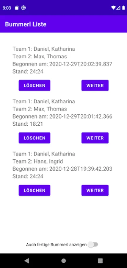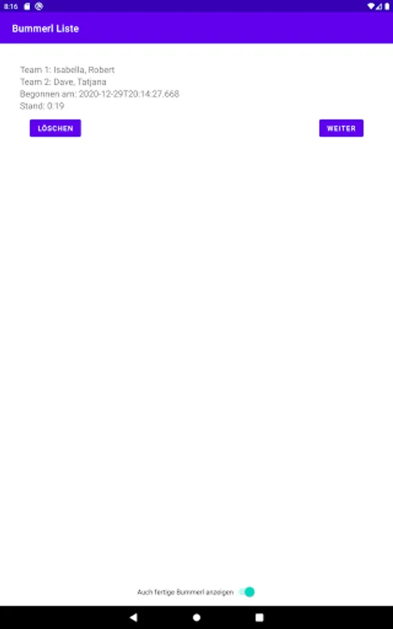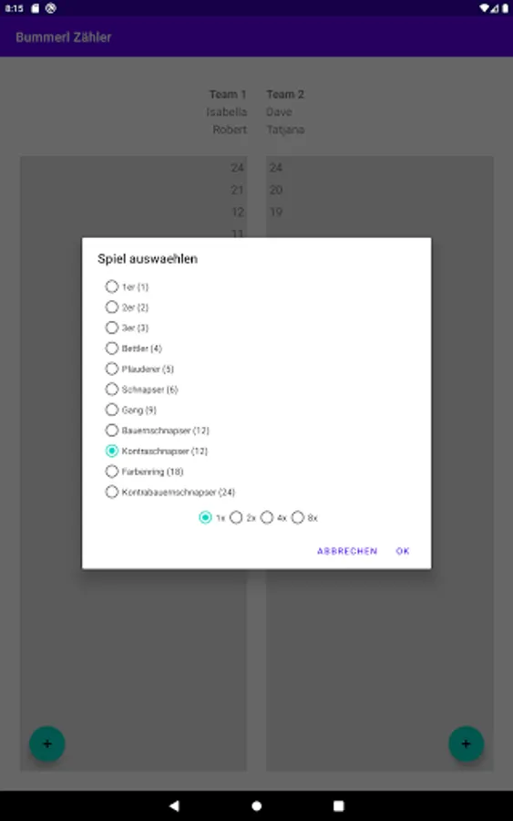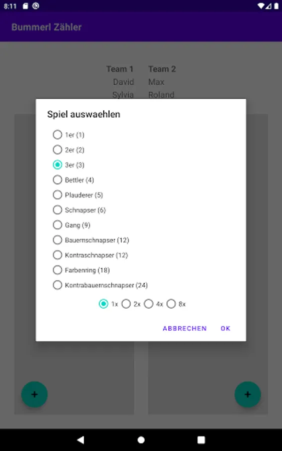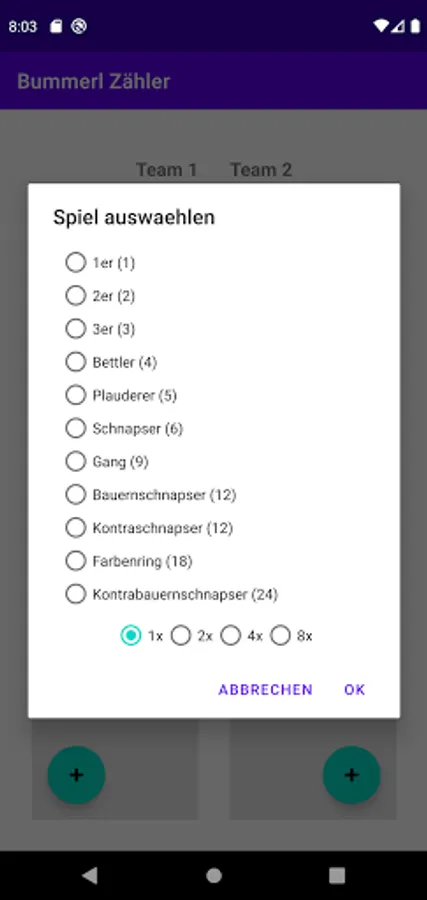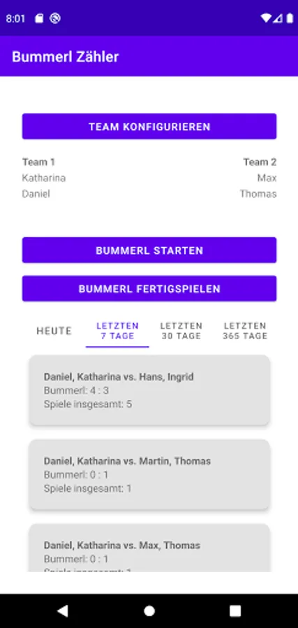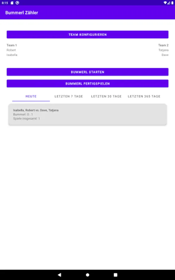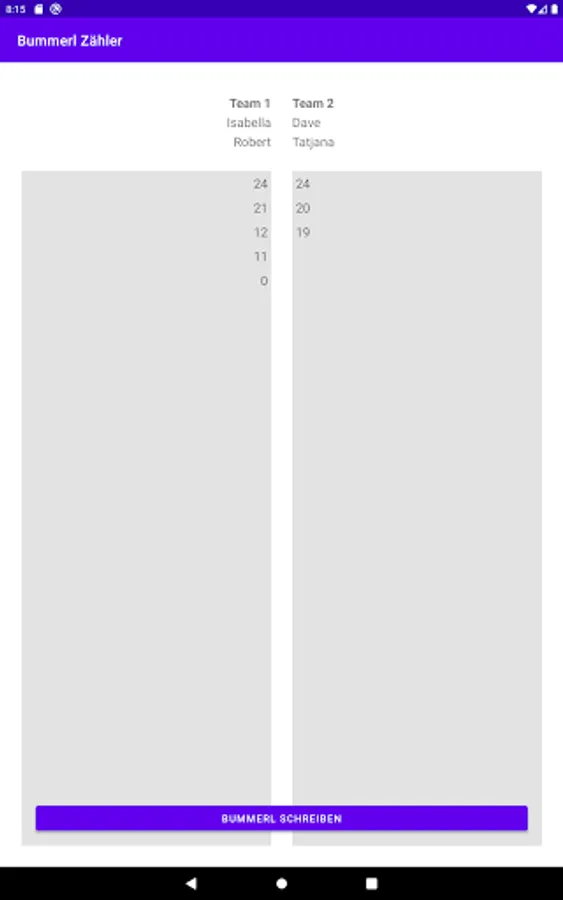 Bummerl Counter makes it easy to take notes on the Bauernschnapsen. The app allows any team to be set up and saves all played Bummerl locally. It shows statistics for all Bummerl from the last year.