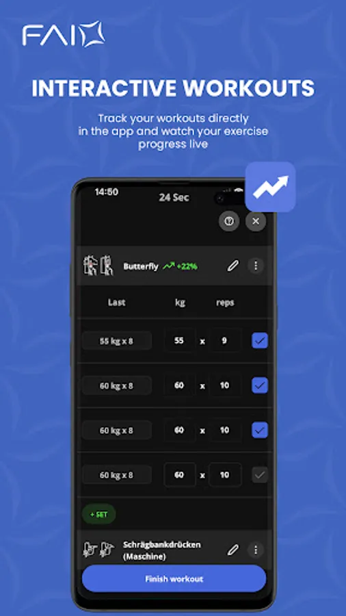 Training progress and statistics - Keep track of your training successes and progress. FAIO Fitnesscoach automatically records your workouts and shows you detailed statistics to track your performance over time and stay motivated.