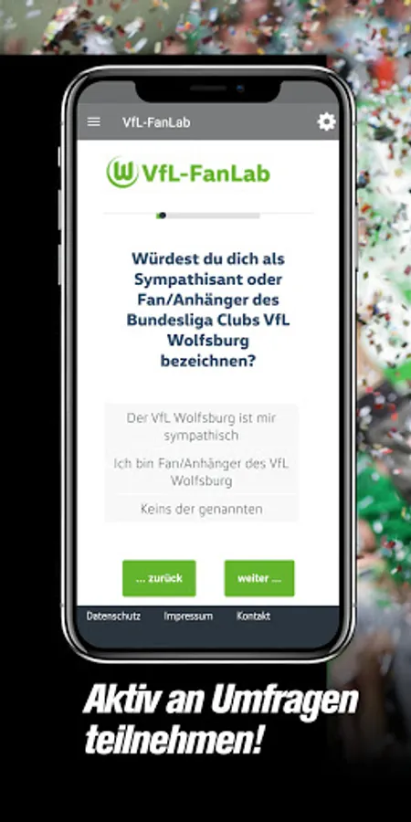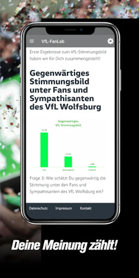 As a registered member, you will receive regular e-mail invitations to current surveys. The range of topics is broad. Stay tuned for interesting and varied questions on trends, media, products and services related to VfL Wolfsburg.