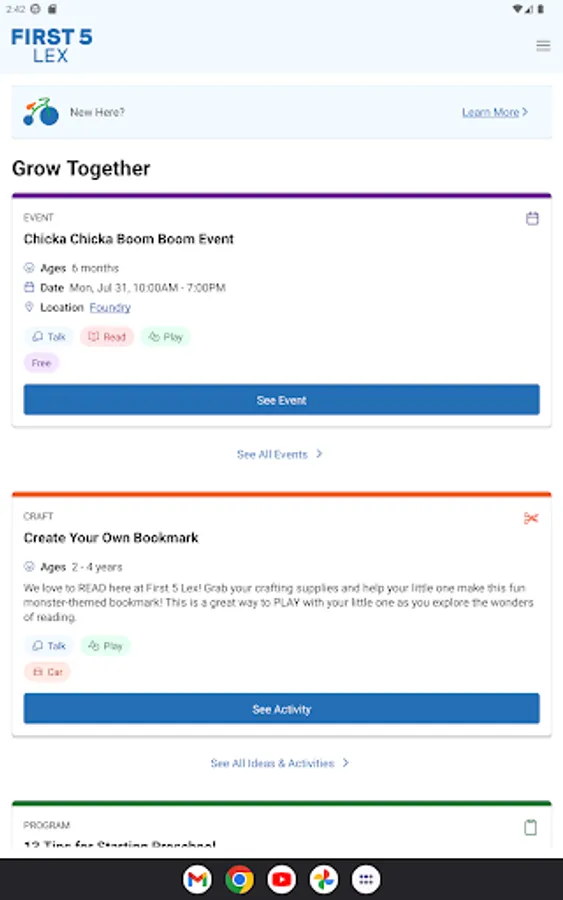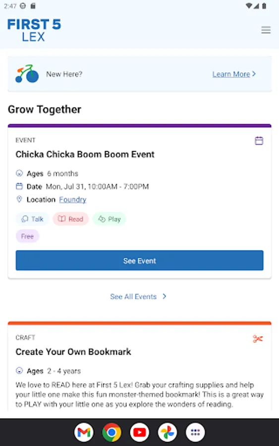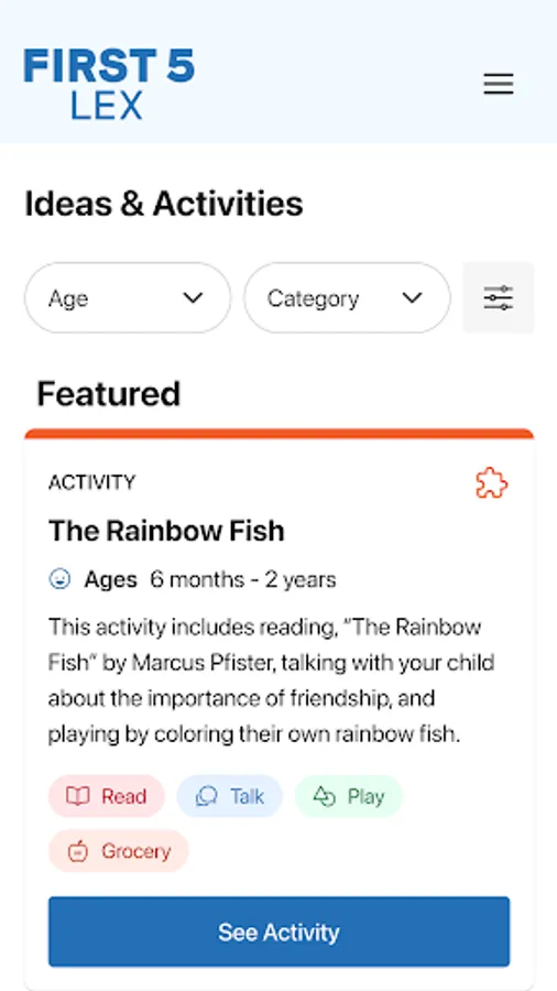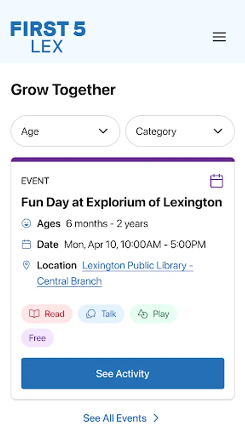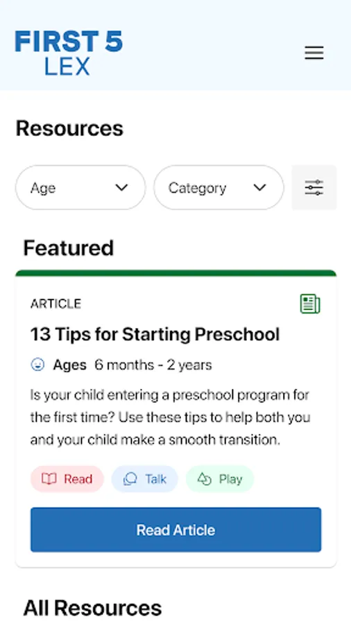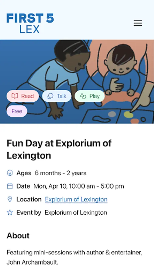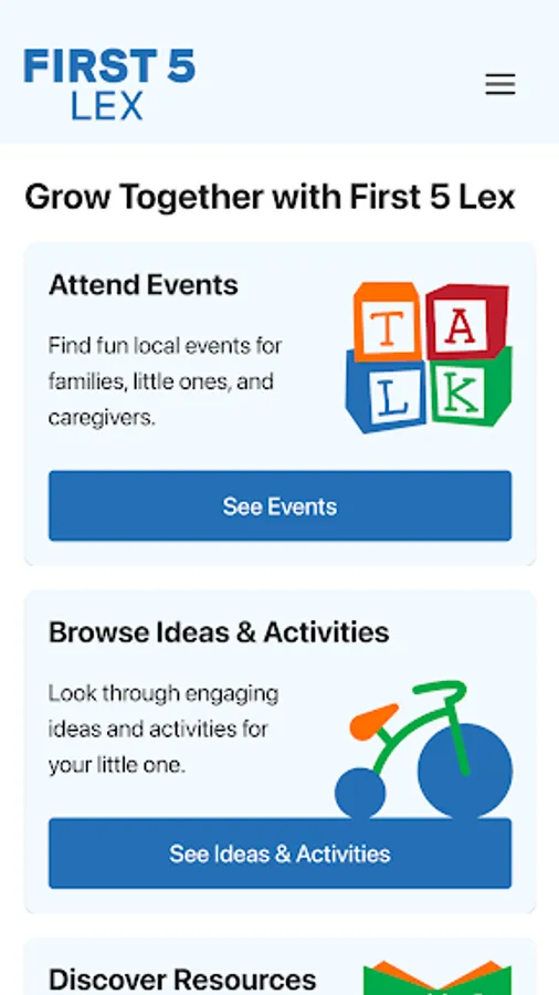 The First 5 Lex app is an early childhood education hub for families and caregivers of children ages 0 to 5. Created by teachers and education experts, it is packed with data-backed resources, fun, age-appropriate activities, and details about local events for families, caregivers, and young children. So you can focus on what’s most important: connecting with your little one.