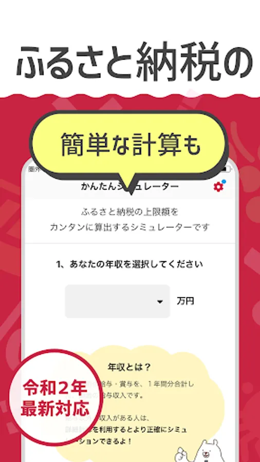 Furusato Tax Deduction Calculator is a free simulation app that automatically calculates the maximum amount of tax deductible for Furusato Tax Payment.