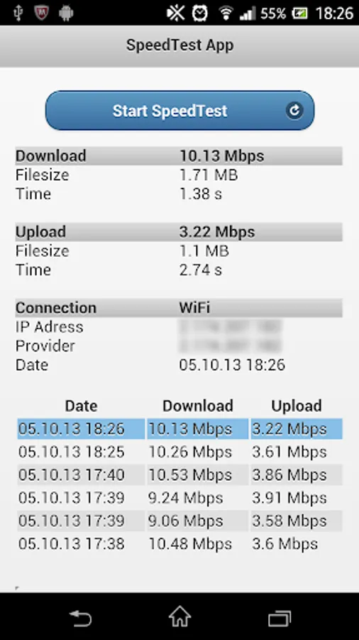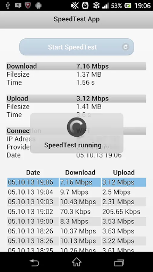 The SpeedTest App shows your download/upload speed and display your current IP adress.