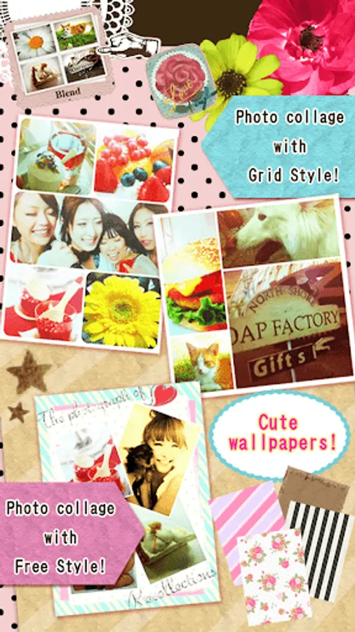 You can be combined in one photo multiple photos called collage, to use the function of photo manipulation. After using the "Frame Layout", you can be placed in combination in a frame that is one fixed multiple photos of up to eight. You can use the "free layout", you can be placed freely like size, orientation, layout, to form a plurality of up to 15 sheets. Because we have prepared a pretty background image, you can freely combine multiple photos! You can also create scrapbook of your