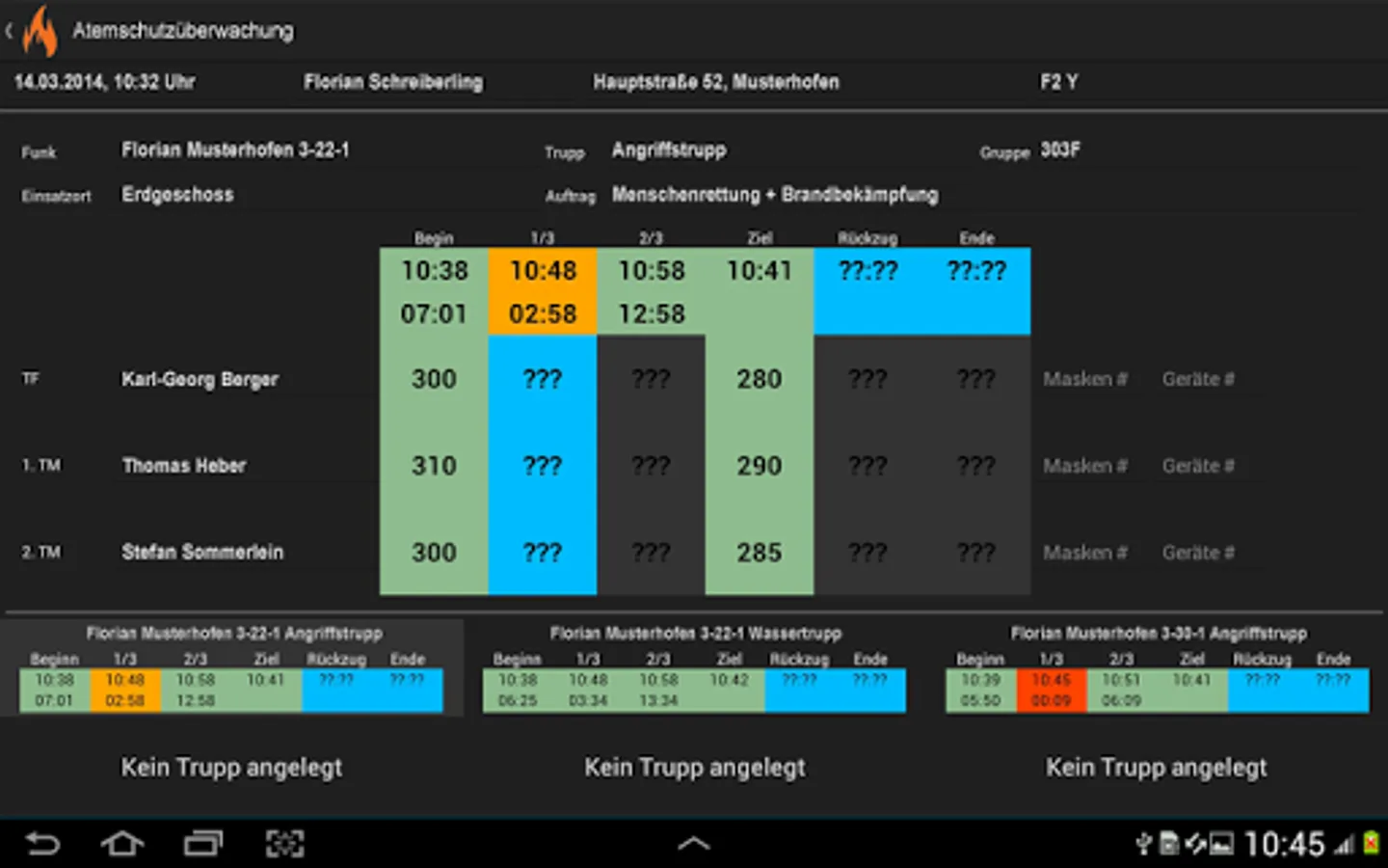 It can monitor up to 6 squads simultaneously. Per squad, input is up to three squad men. Based on the input connection time and estimated duration of use, a calculation of the query times. Pressures can be entered only if the query time is plausible, this prevents incorrect entries from the outset. The inputs for times and pressures follow a simple color coding.