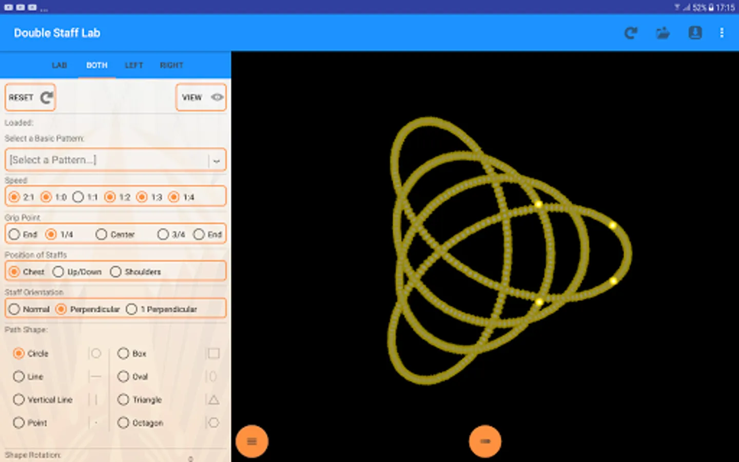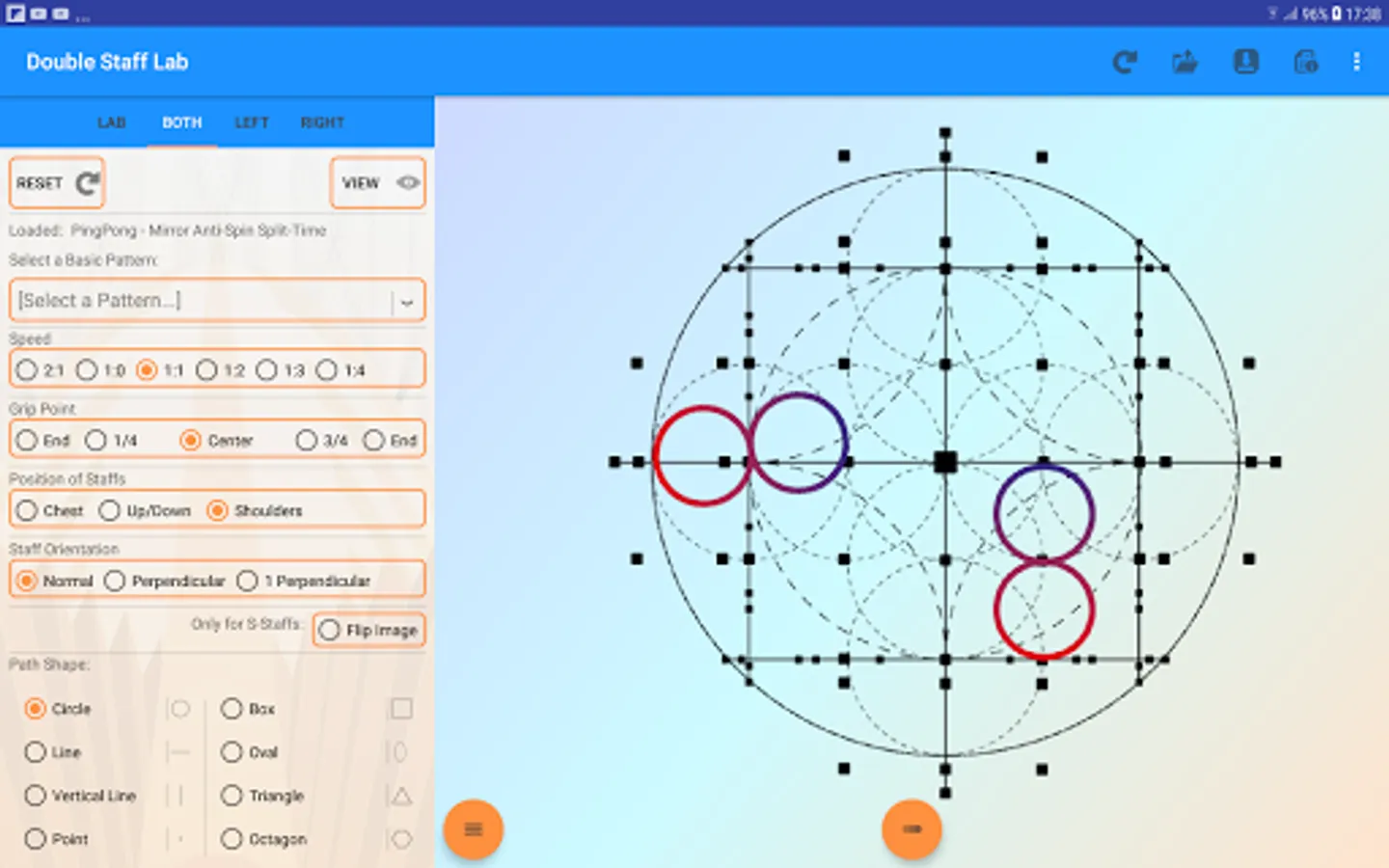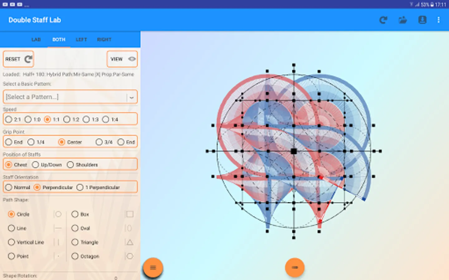 In terms of modification, you can either modify both staffs at once, or for very detailed control, each staff individually. Controls range from the direction of the staff and the path of the hand, to the speeds of both, the shape of the hand path (usually a circle) to even where you 'grip' the staff.
