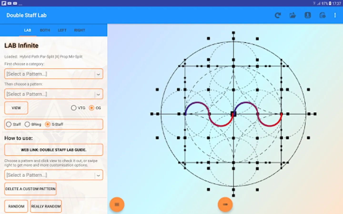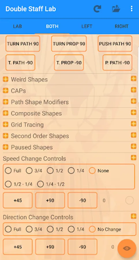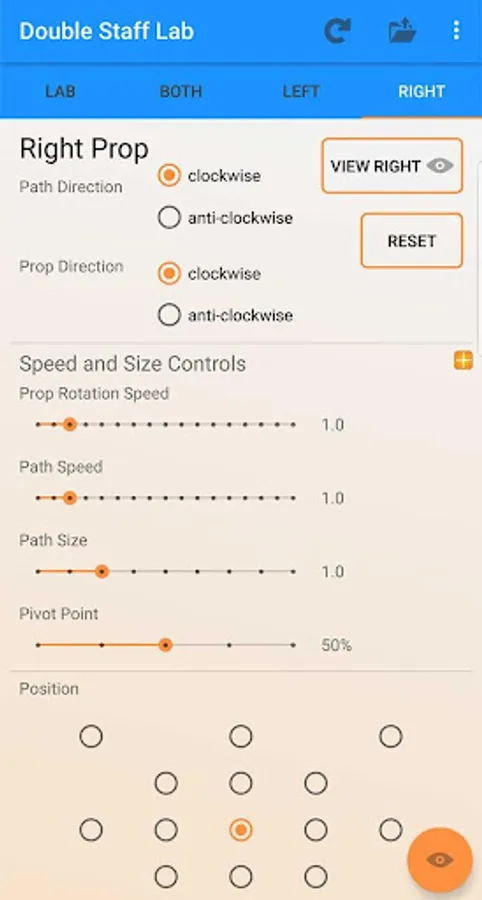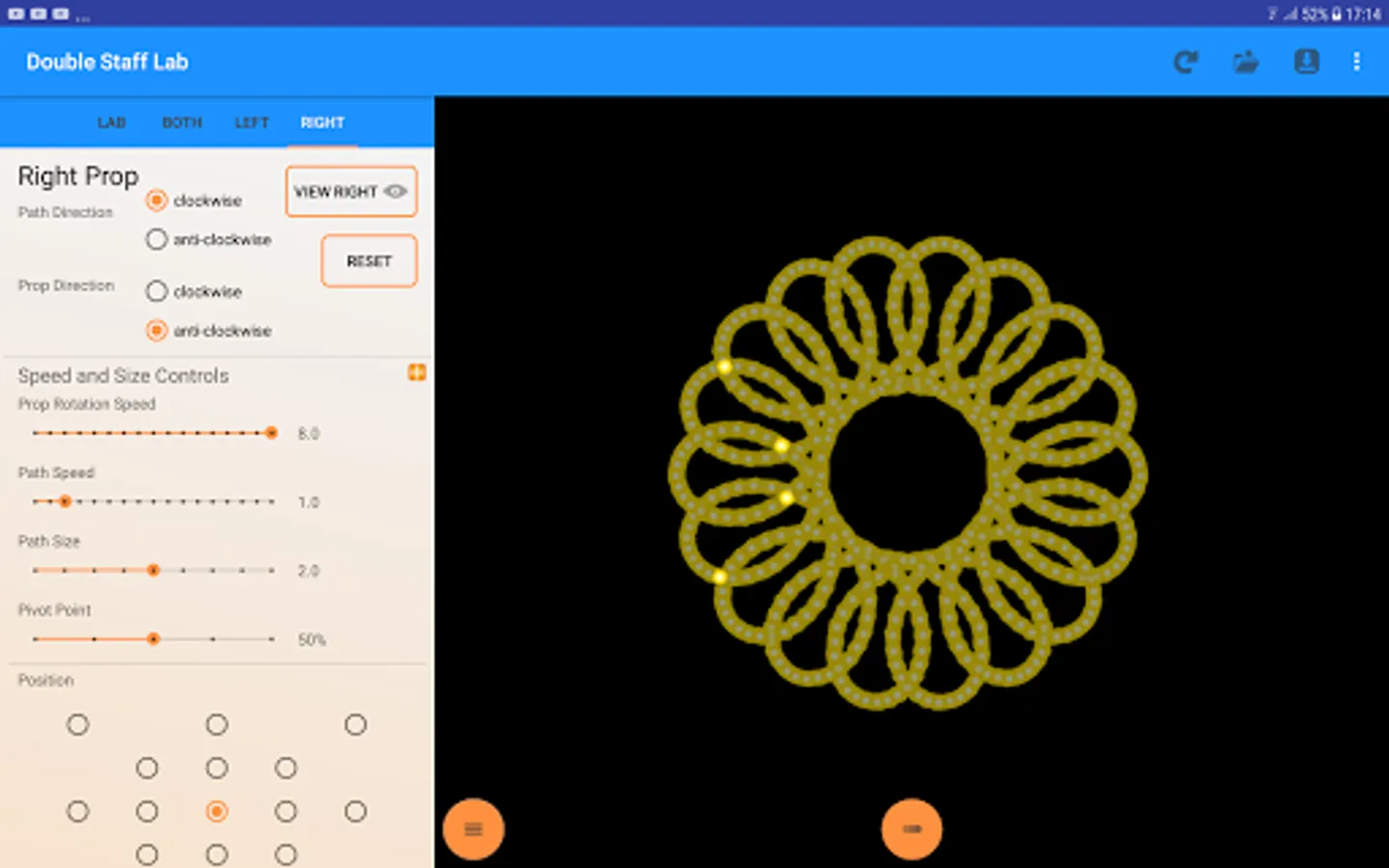 In terms of modification, you can either modify both staffs at once, or for very detailed control, each staff individually. Controls range from the direction of the staff and the path of the hand, to the speeds of both, the shape of the hand path (usually a circle) to even where you 'grip' the staff.