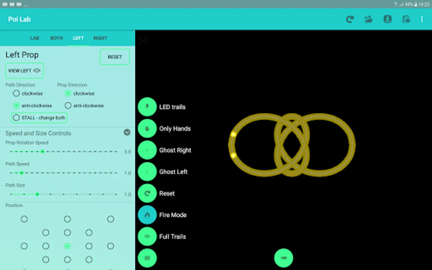 It displays a 2D representation of the poi move, to aid your spinning and learning. It has a fire trails mode: so that you can see what it'll look like before spending time learning it and a trails mode, mostly just because it looks cool. You can also slow down the motion of the poi to understand it better, or you can just view one poi at a time.