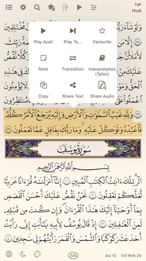 • Verse-by-verse audio recitation by multiple reciters (Abdulbasit, Al-Minshawi, Maytham Al-Tammar,...)