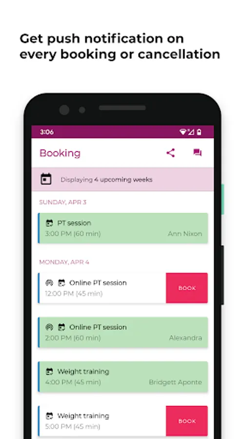 New clients can learn more about you through pictures and bio, discover your schedule, and book your personal training sessions on the spot.