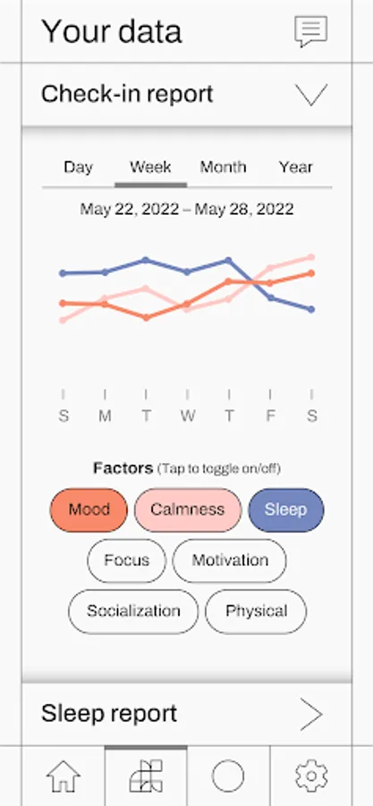 You can view your data in easy to understand reports, charting how the factors that affect your mental health and wellbeing change over time. Once a month, myala offers a survey that measures flourishing, and gets summarized into a “Flourishing” factor.