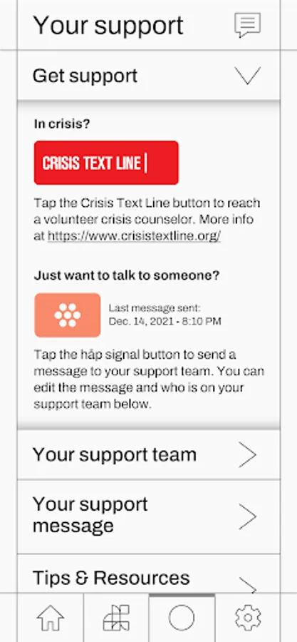 myala allows you to add a personal support team by inviting supporters to the app. Simply pressing the myala signal under “Your support” sends a message to your team indicating you need some support.