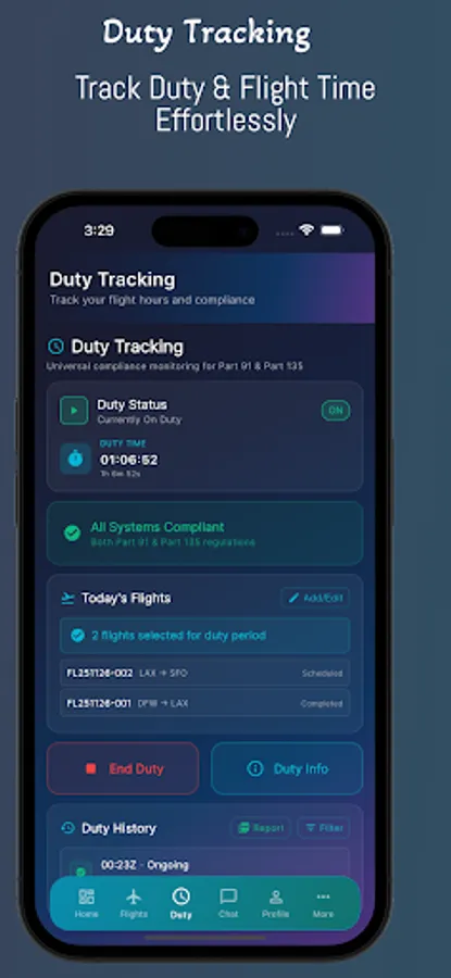 • Automatic duty & flight-time tracking (Part 91,& 135)