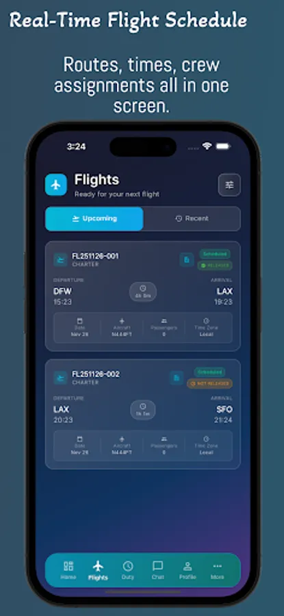 • Real-time flight details, routes, and assignments